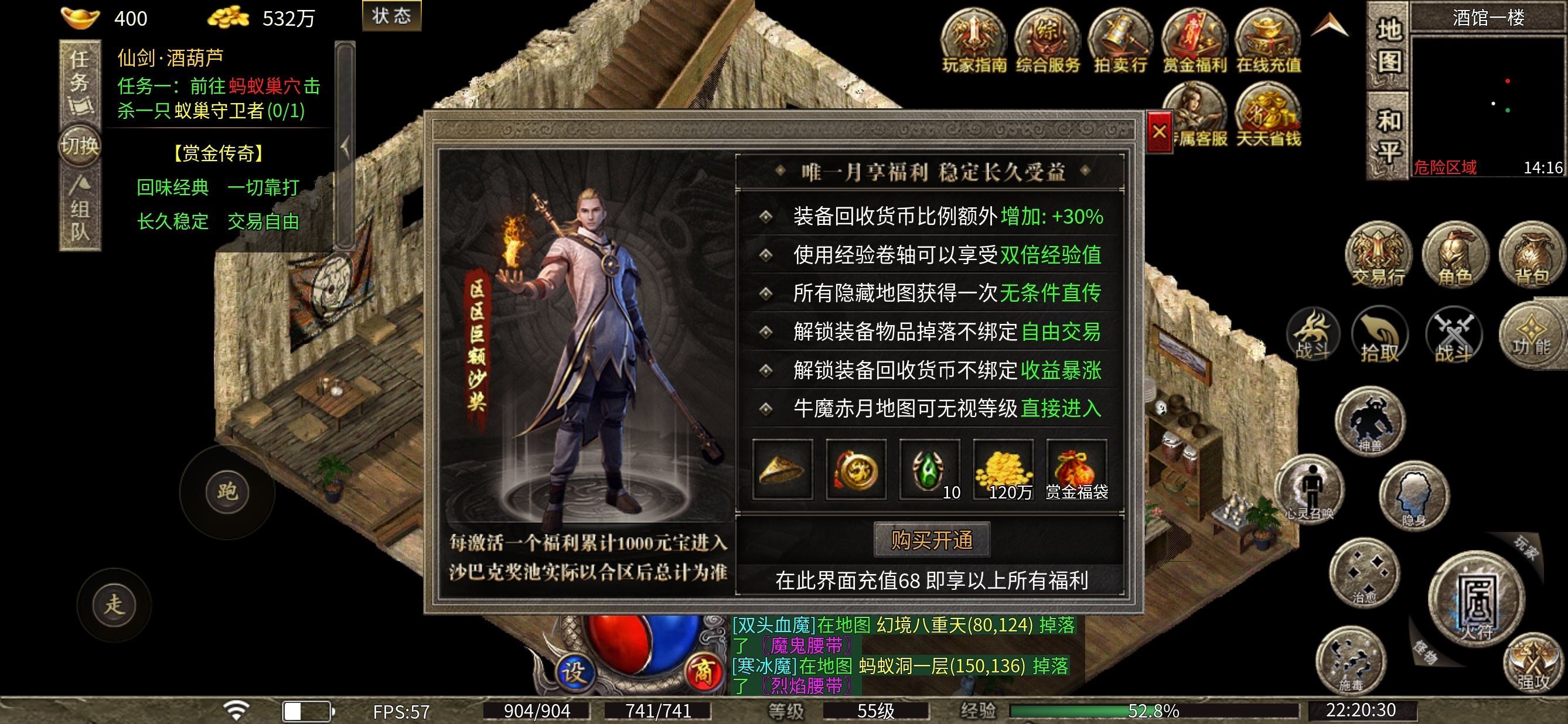 月卡必备,68米开通,物品货币解绑,回收加成,经验券双倍经验,隐藏地图直传,牛魔赤月地图无视等级 直接进入, 地图直传也非常重要省去了前期和大部队抢怪的烦恼