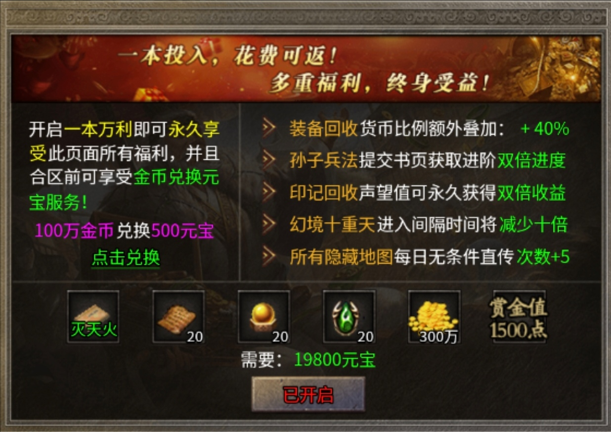 至于19800元宝的一本万利,就看各自的需求开通了,可以说是月卡的加强版,当然费用也是多倍加强了