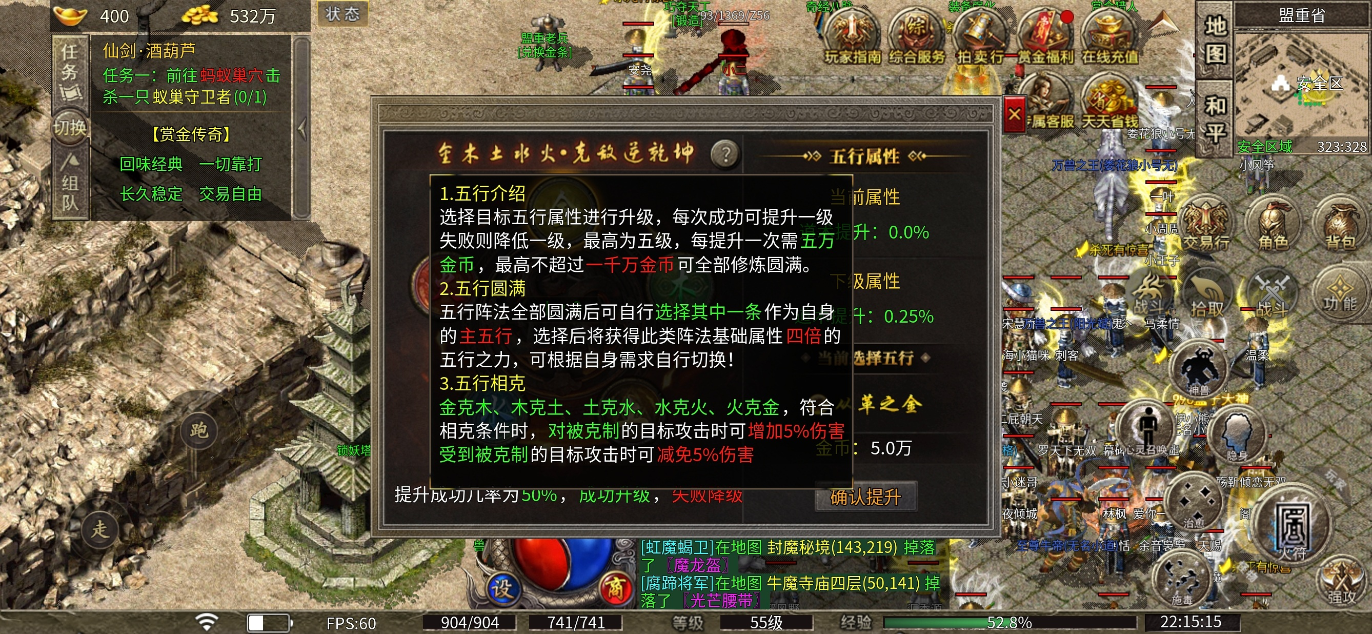 五行属性玩法,一个是五行属性的提升,不同的五行对应不同属性,满级后可自由切换,另外一个呢,就是有两个地图需要相应的五行才可以进入。
