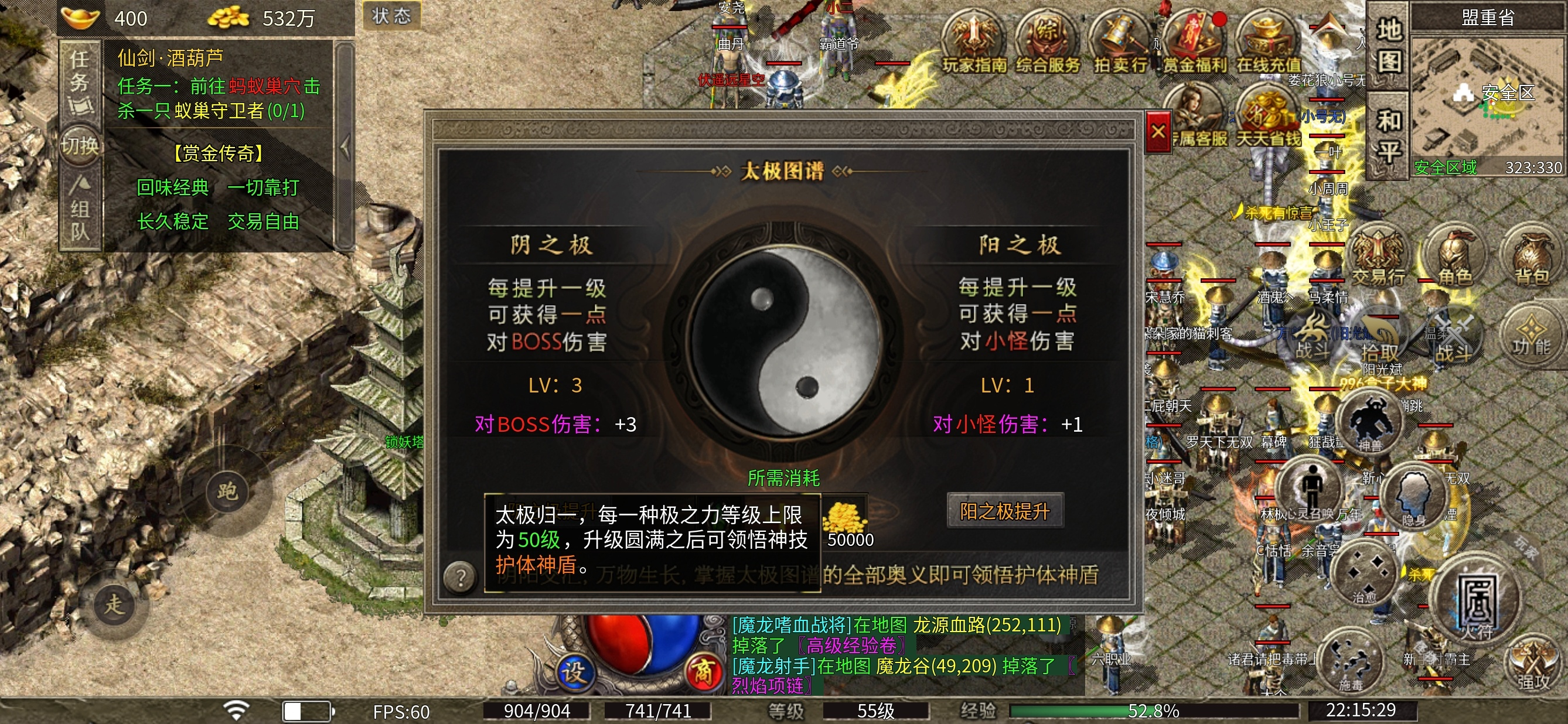 太极图腾,每种等级上限为50级,满级后自动领取护体神盾神技,玩的时间比较多,那就推荐,先升阴之极增加boss伤害,如果肝的时间比较少 长期挂机,推荐先升级阳之级,升级材料比较难爆,紫怪基本不出,黄怪和红怪才有机率