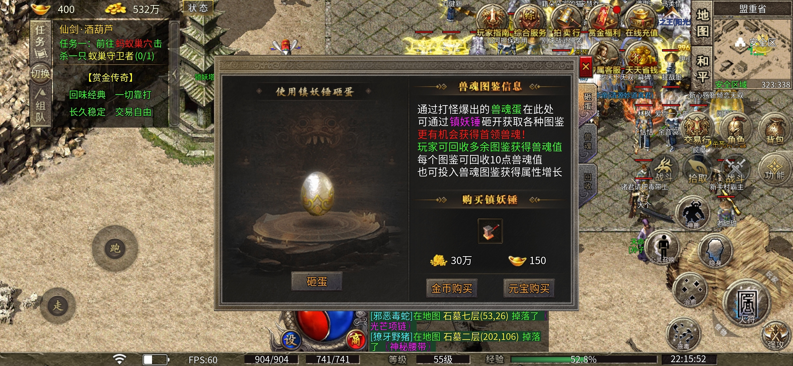 怪兽图鉴,宠物蛋打怪会爆,开启需要花费30万非绑定金币或150非绑定元宝,打开后会有怪物出现,每页齐满后可以进行觉醒,类似于天命,也可花费6种首领图鉴合成天命石进行洗炼。