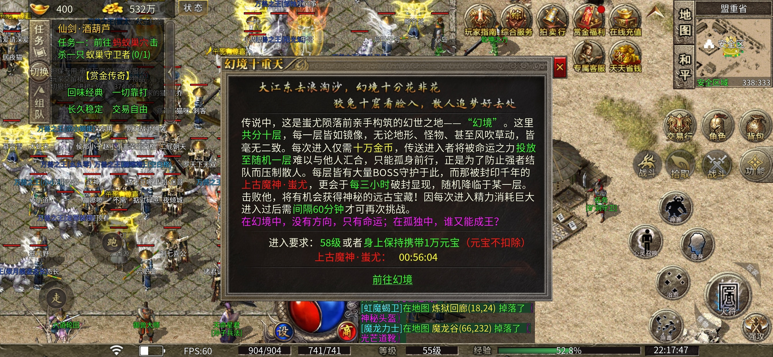 幻境地图,进入条件 需要身上携带1万元宝,不充值这个玩法也体验不了,如果没有开通一本万利,那么你进入了CD需要60分钟一次,有的说可以小号进入找boss ,然后让大号来打,分下红,我没体验过