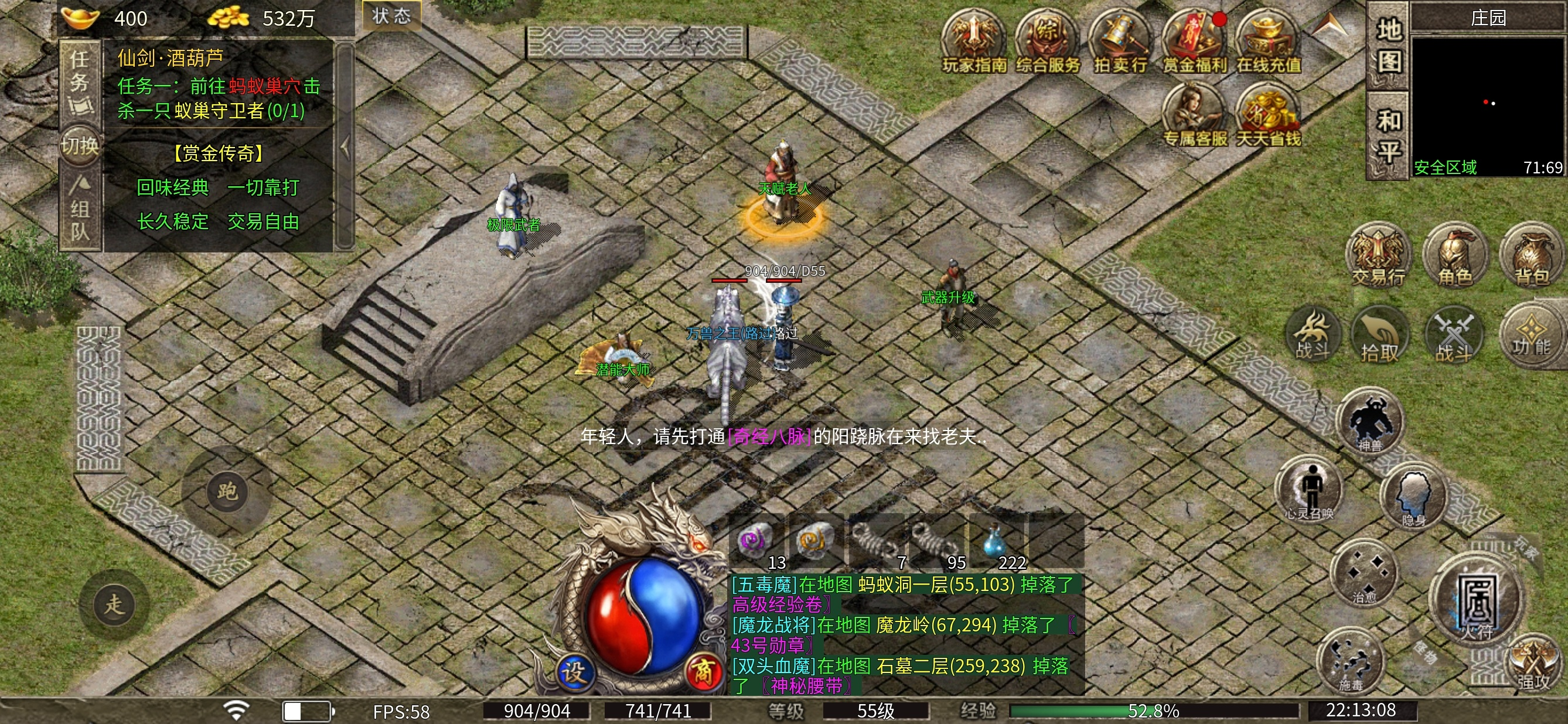 最后 庄园里还有4个NPC,天赋老人需要把奇经八脉升满,武器升级,红色装备潜能强化等功能玩法