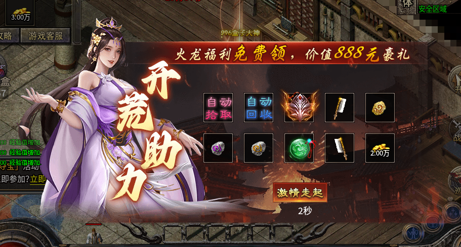 一进服,就能看到 “开荒助力” 活动,价值 888 元的豪礼免费领!自动拾取、自动回收这些实用功能到手,打怪效率直线飙升,还有各种强力道具,让你开荒之路畅通无阻。