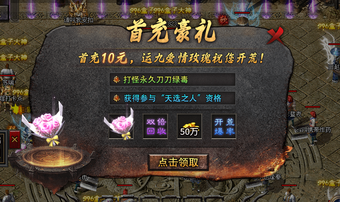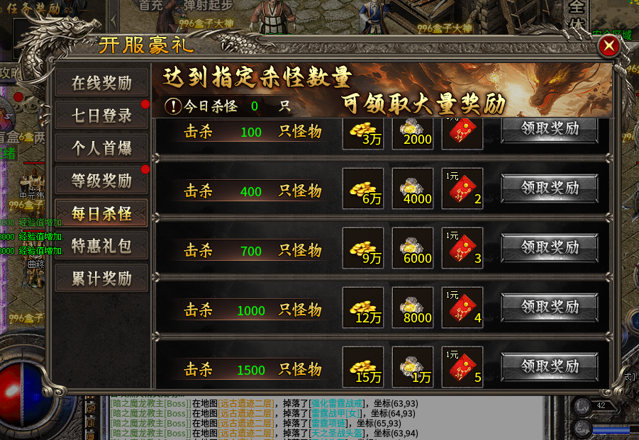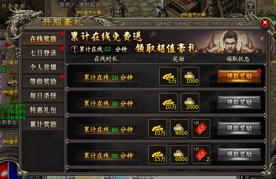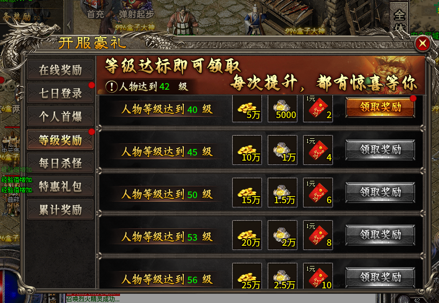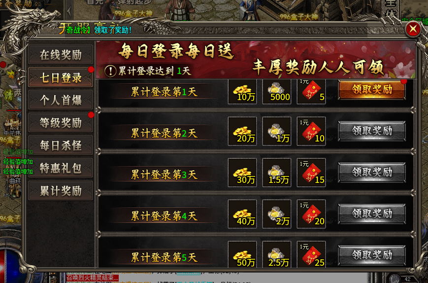 在线奖励超丰厚,累计在线 10 分钟就能领 5 万金币和 1000 其他资源,90 分钟时能拿到 15 万金币、6000 资源和 2 元红包。七日登录奖励递增,登录 5 天能拿 50 万金币、2.5 万资源和 25 元红包。等级奖励也不逊色,40 - 56 级,每提升一个阶段都有金币、资源和红包拿。每日杀怪达标,100 - 1500 只怪,都有对应金币、资源和红包奖励。累计充值达到 38 - 288 元,能领海量金币、珍稀道具,像隐身术、地图直传等。