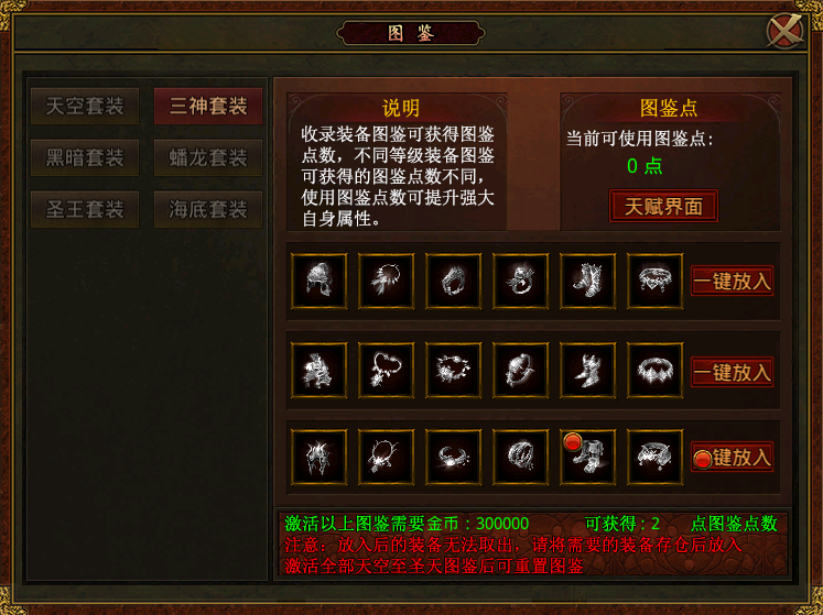 游戏的装备系统也延续了传世的特色,玩家耳熟能详的将军套、逆魔套、圣天套、流金套、盘古套、太初套等近千件装备神器都可以在这里逐一收集体验,部分关键套装还可以完整获取后提交到图鉴系统来解锁升级图鉴天赋,大幅度提升角色的属性能力,让战力更上层楼。