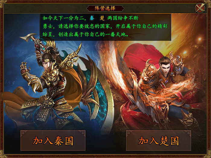 传世游戏的最大特色就是更大规模的国家阵营,《焚天烽烟录》将游戏世界设计为秦楚两国阵营,喜欢历史的玩家都知道,春秋战国时期的秦国与楚国可谓极有渊源,在合作和敌对的纠结中足足延续了上百年,将这两个有代表性的国家作为游戏中的对抗阵营,可以说设计者非常有想法了。