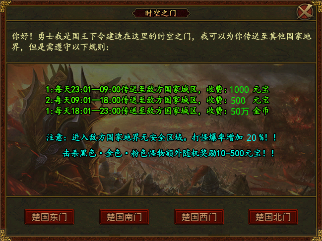 和帮会盟会这种可以慢慢自由选择的社交系统不同,在《焚天烽烟录》中玩家加入游戏时就要先选择效忠的国家,后续所有玩家都可以以国家身份直接参与“国战”!62级之后,可传送至敌方国家的时空之门就可以打开,即时玩家就可以传送至敌方国家地界,参与国战,斩杀敌将!