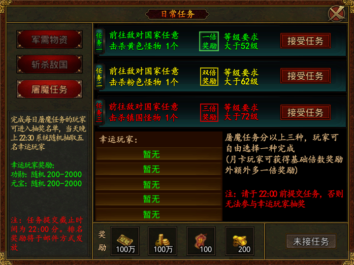 当然,想要为国尽忠,还可以通过军需物资、斩杀敌国、屠魔任务这三类国家任务来实现,分别要求玩家捐献指定的装备和材料、击杀指定数量的敌国玩家、通过神秘之门潜入敌国地图去击杀各类怪物。可以说从后方到前线,从卖力到冒险,全方位地给玩家带来“乱世风云”的感受了。除此之外,两国玩家还可以参与国战,就像传奇游戏中沙巴克的全员上阵一样,去体验同仇敌忾的豪情。