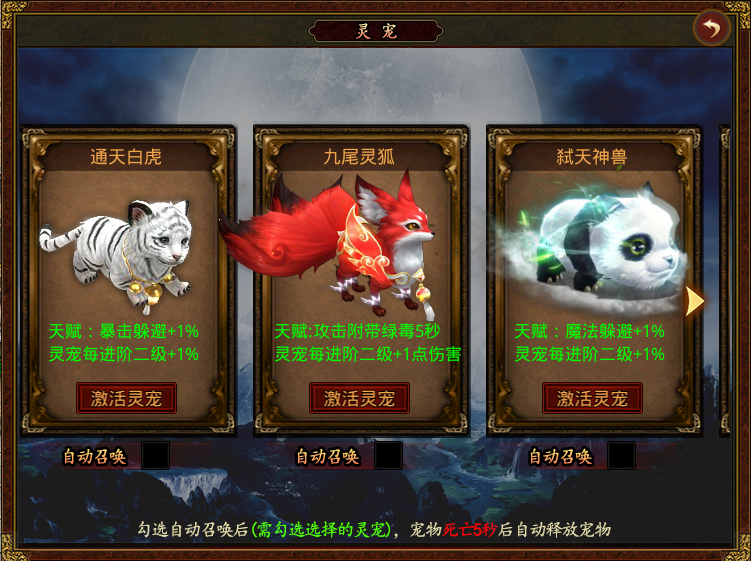 灵宠系统能让三种职业的玩家都可以得到宠物的助力,灵宠共有5种,其中通天白虎能增加暴击躲避率、九尾灵狐能增加攻击附带绿毒、弑天神兽能增加魔法躲避值、雷霄灵兽能增加每秒生命回复值、瑶池仙鹿能增加暴击免伤。