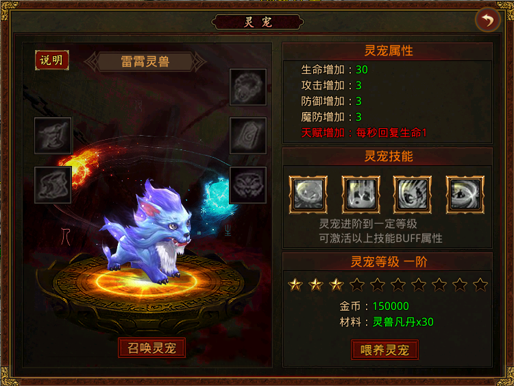 玩家可以根据自己的职业特点和游戏习惯去选择最合适的灵宠,通过喂养升级逐步提升它的天赋能力。当灵宠进阶到指定等级后还能激活特定技能buff属性,进一步提升玩家的红蓝、双防、攻伤等属性。