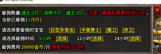 下面给大家说说大号咋玩吧,不想氪金的一百以内的开通月卡,新手礼包直接买了这个前期必备,有一根金条,这是GM送的福利,没买的月卡里面用充值币换点金币,能买尽量买,等待区时候注意把boss提示都加上,幻境十层离不了,等待区挖完矿以后,大资金的魔王岭一键完成,小资的带着虎卫去干boss,这边就推荐主体玩法师了,法师首次可以免费雇佣5次虎卫,记得选24小时的哦