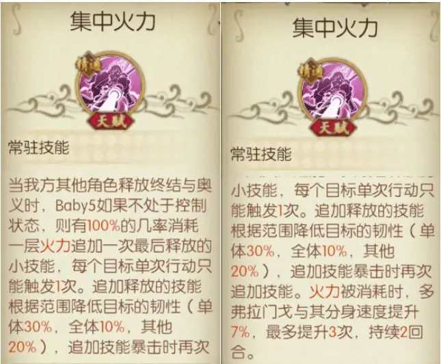 60级天赋【集中火力】:队友放终结或者奥义,只要Baby5不被控制(眩晕石化),都可以消耗一层【火力】追击一次,期间如果追击技能暴击了会再追击一次,直到火力被消耗完。【火力】50级天赋有描述,开局获得3层火力,释放终结我被需要了也可以获得3层火力,所以实战过程中只需要记住这两点,就可以自己算出来还剩几次火力、能够追加几次了。