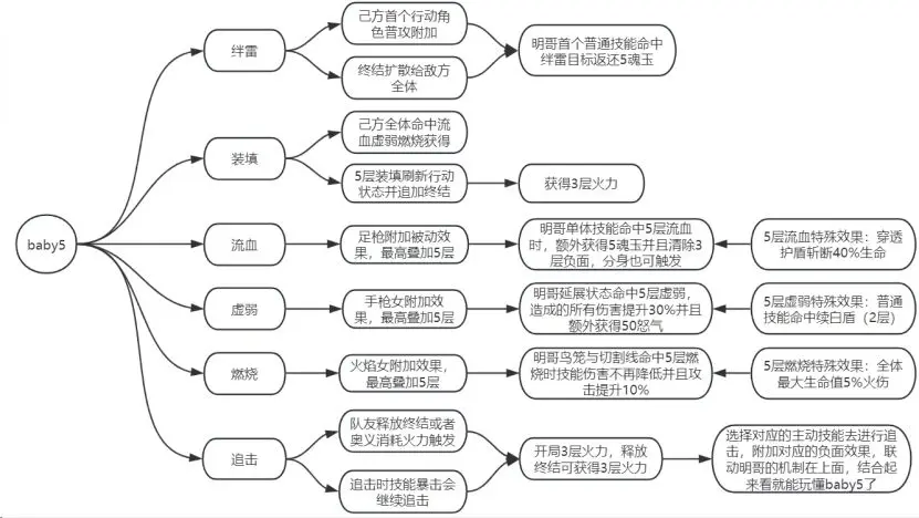 Baby5 的主要负面分为3种,虚弱、燃烧以及流血,每个负面都对应明哥不同玩法的加成。但请注意,都是需要五层负面哦,这就对应了为什么要让Baby5多动的原因,方便叠满一种负面满层。