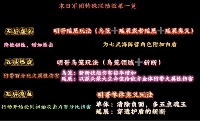 五层燃烧既适合鸟笼玩法,也适合延展玩法,加成不一样,这两个负面所对应的技能都是全体技能,所以敌方每个人都能挂上。