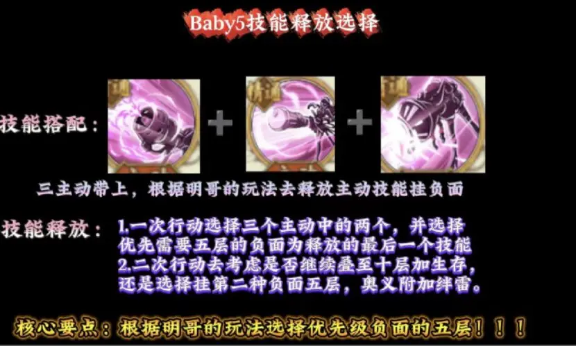 在Baby5多动的中间,会有一个关键节点,就是你已经叠满了某种负面五层,你可以选择继续叠加10层加伤害减免,也可以选择换一个负面继续叠加五层,然后释放奥义去添加绊雷效果。