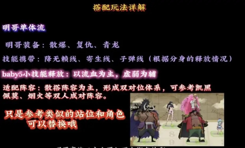 剩下的流血负面所对应的技能是直线技能,且Baby5也是对位角色,这完美符合明哥单体玩法的加成,形成双对位体系。