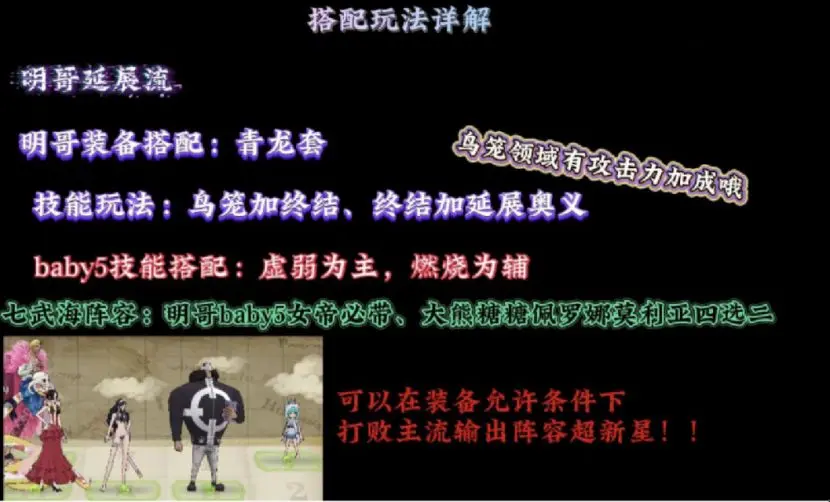 第三种玩法就是明哥的奥义延展流,所对应Baby5的加成便是虚弱,燃烧和流血可以作为下位选择,可以在明哥输出的同时,为全队生成白盾加生存能力,并且一回合双终结或许会变得伤害更加爆炸哦,所以青龙明哥的技能搭配就是切割线加两终结即可。