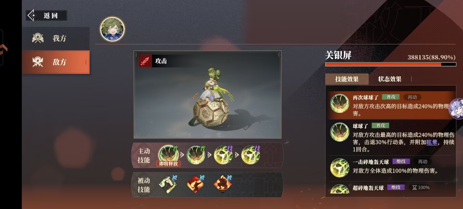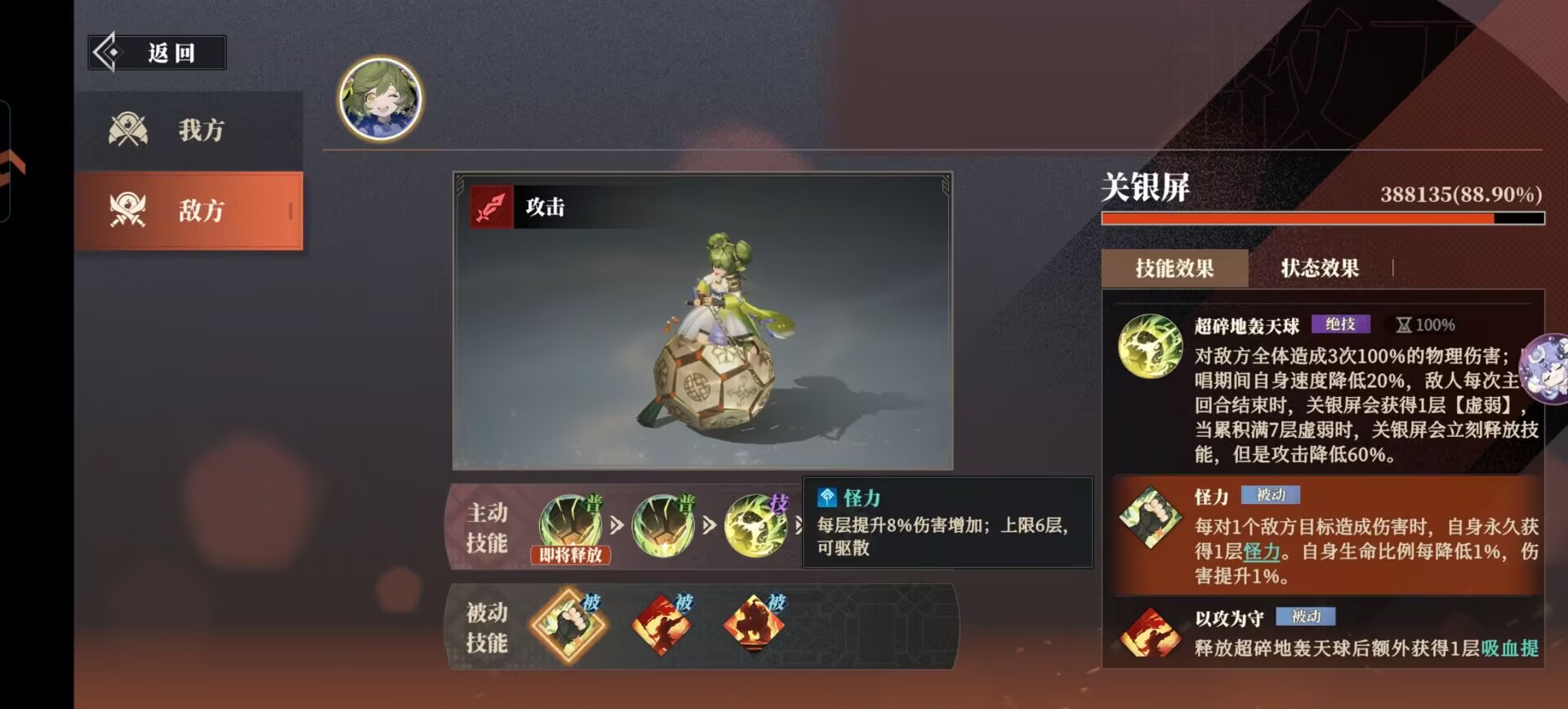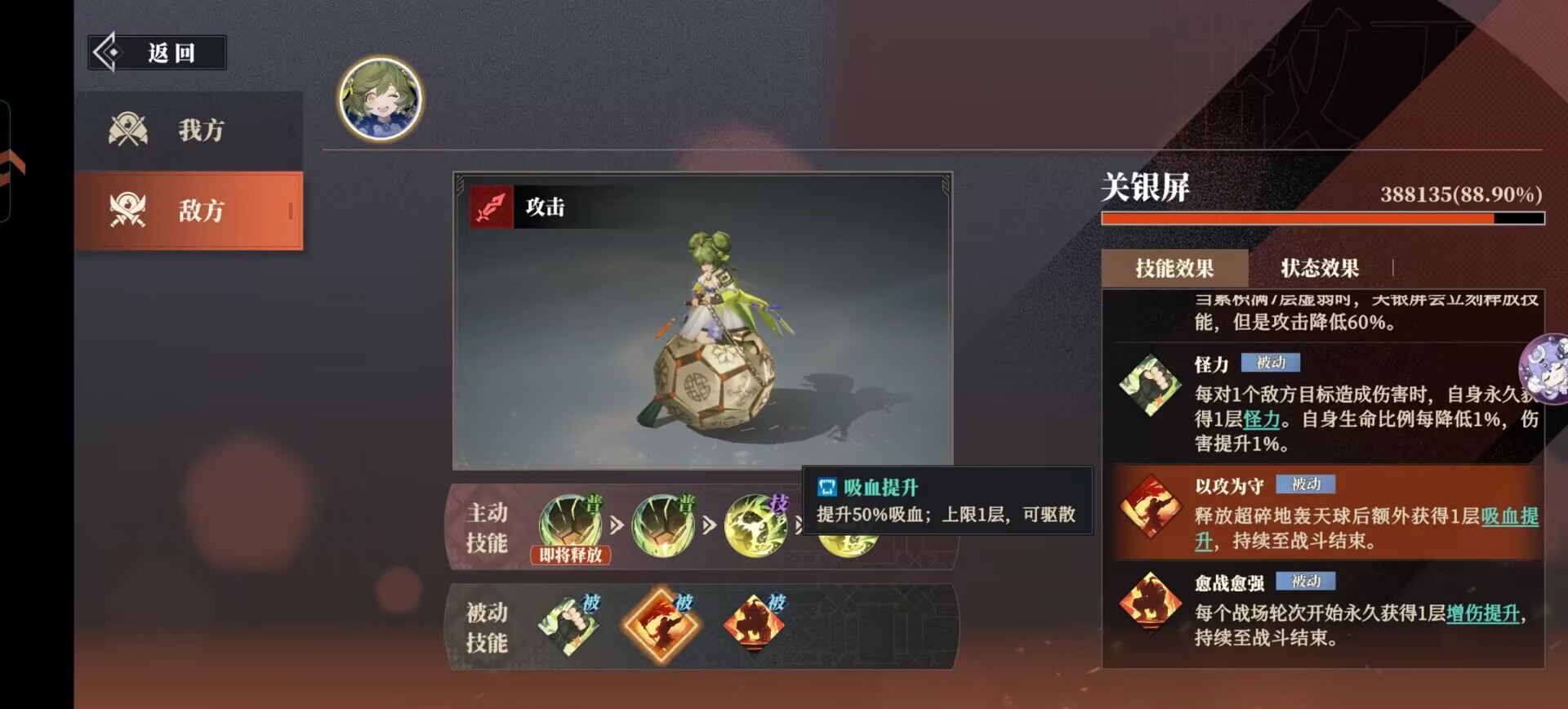 关银屏的被动技能:怪力、以攻为守可以频繁给自己叠增益buff。