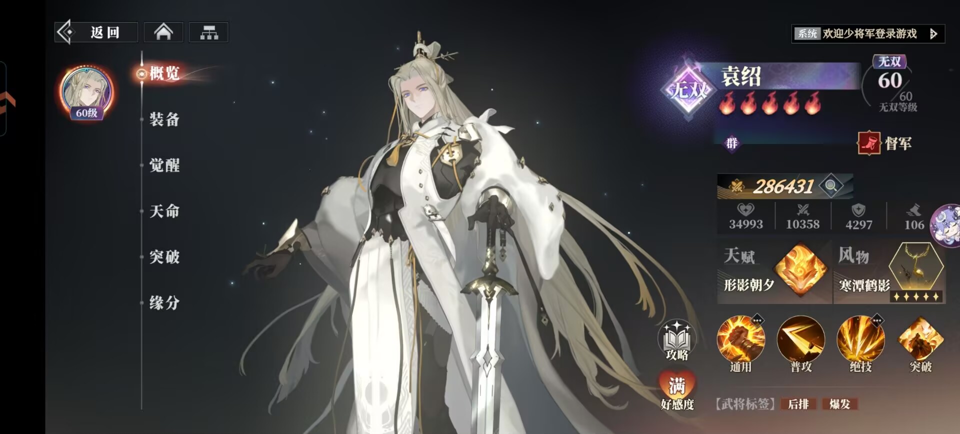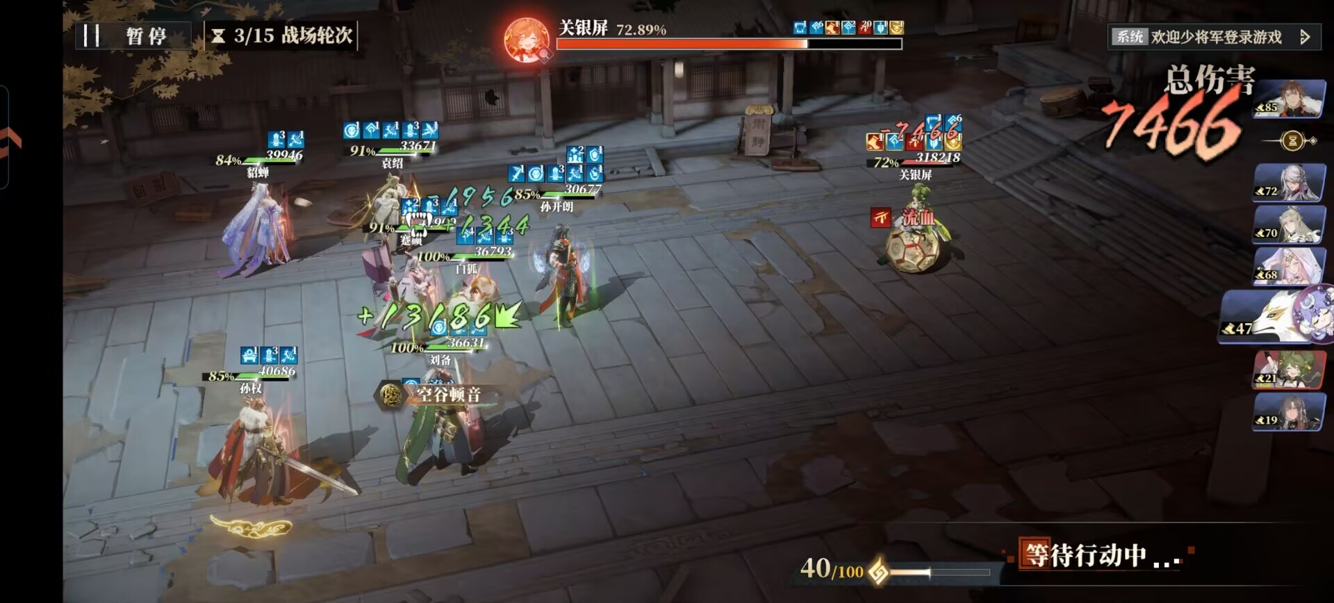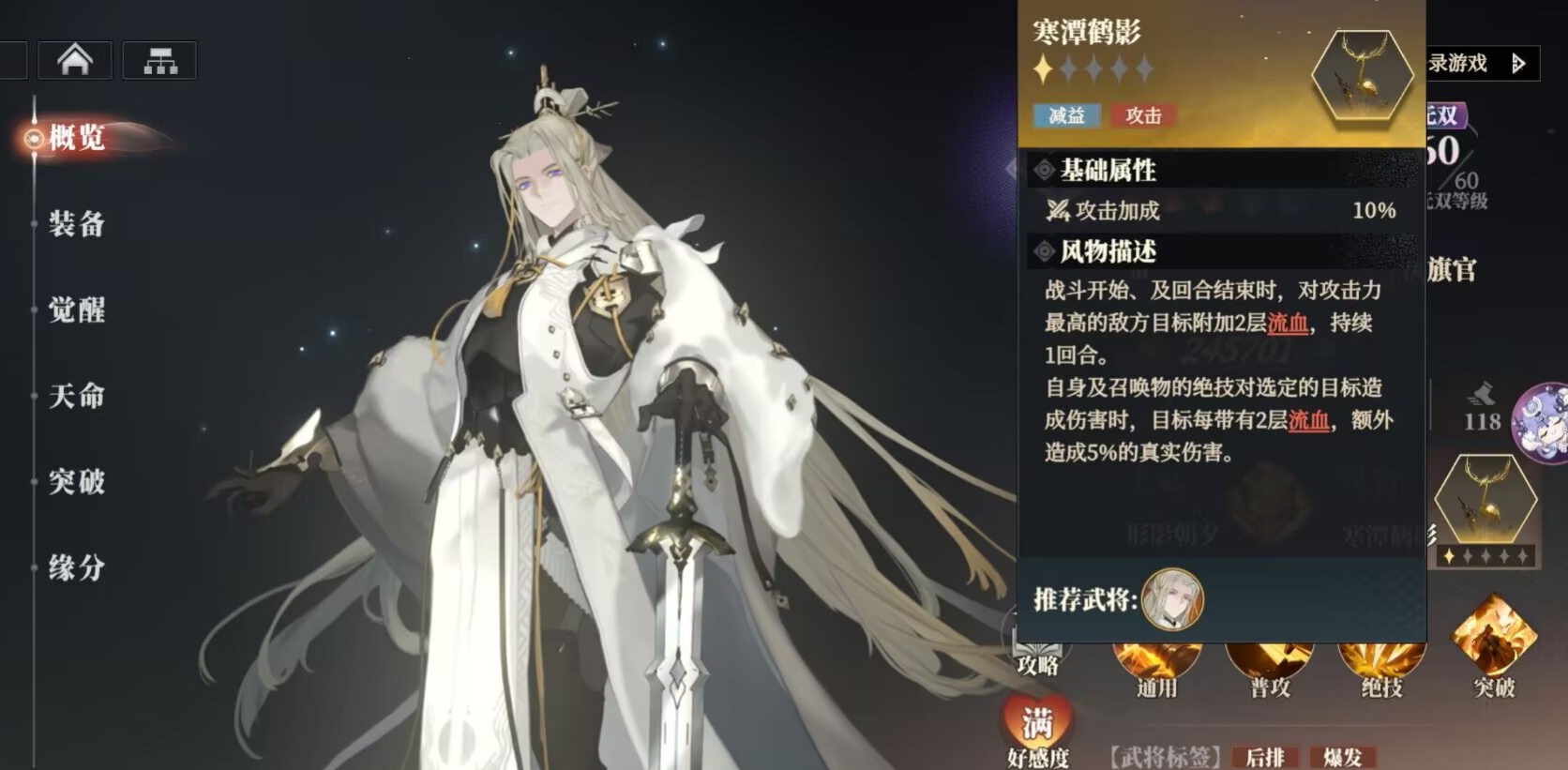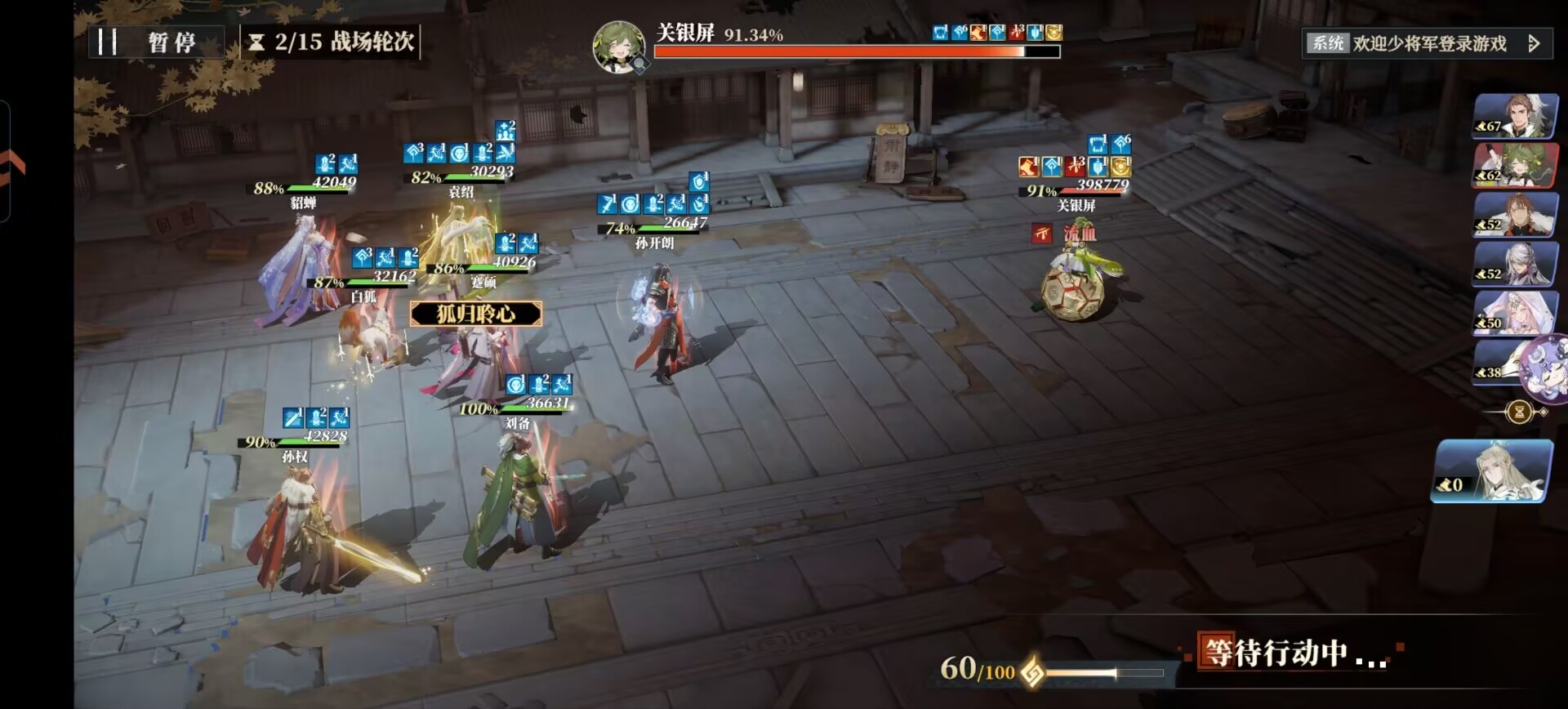 袁绍风物带:专属就行。配合上自己的绝技和白狐可以快速给关银屏叠流血伤害。