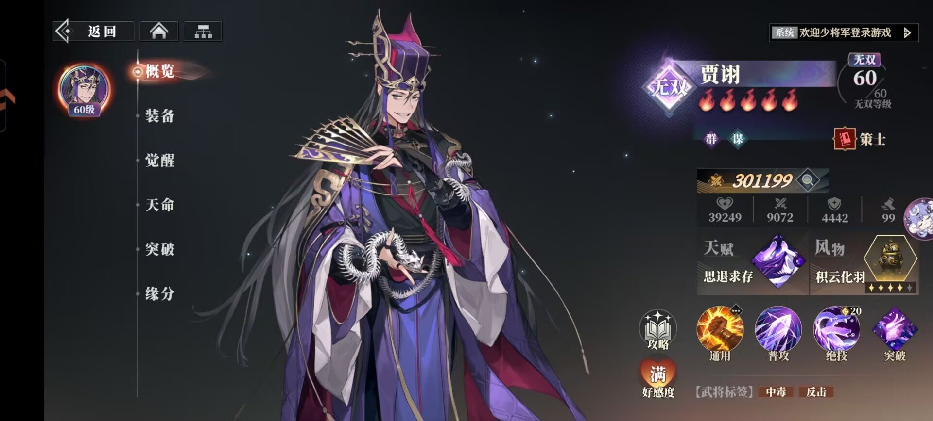 解析:有高练度的贾诩和李儒可以用这套阵容,贾诩和李儒的中毒高伤和降疗,可以有效克制关银屏的吸血效果。