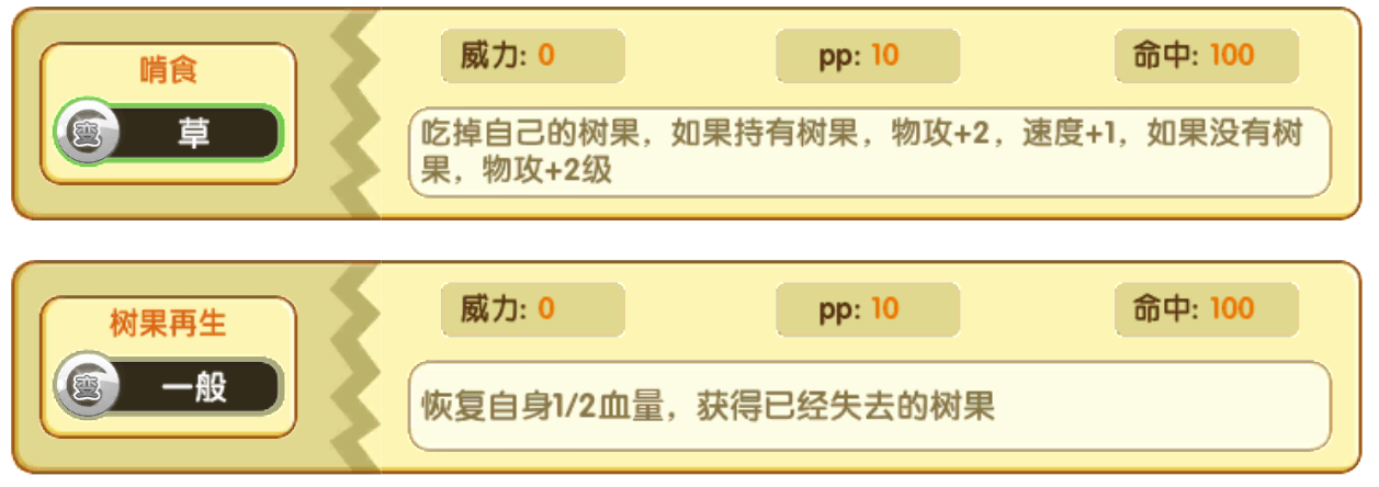 精灵配置说明:大家可以看到,这就是我前面给大家介绍的专属技能和专属特性,这两个技能都是变化类招式,所以我说十分的惧怕挑拨,不过如果先使用啃食,在自己有果实的前提下,自身能够提升速度,而且攻击力会提升三级,因为还有特性可以提升,这个强化能力可以说是非常恐怖的,然后另外一个专属技能树果再生,就是可以把果子再给它找回来,然后再重新吃掉,这样的话攻击力四回合就会增加满了,速度也会相当,于是高速移动了一次