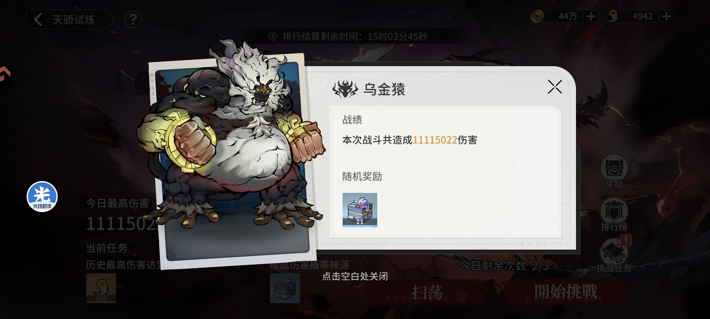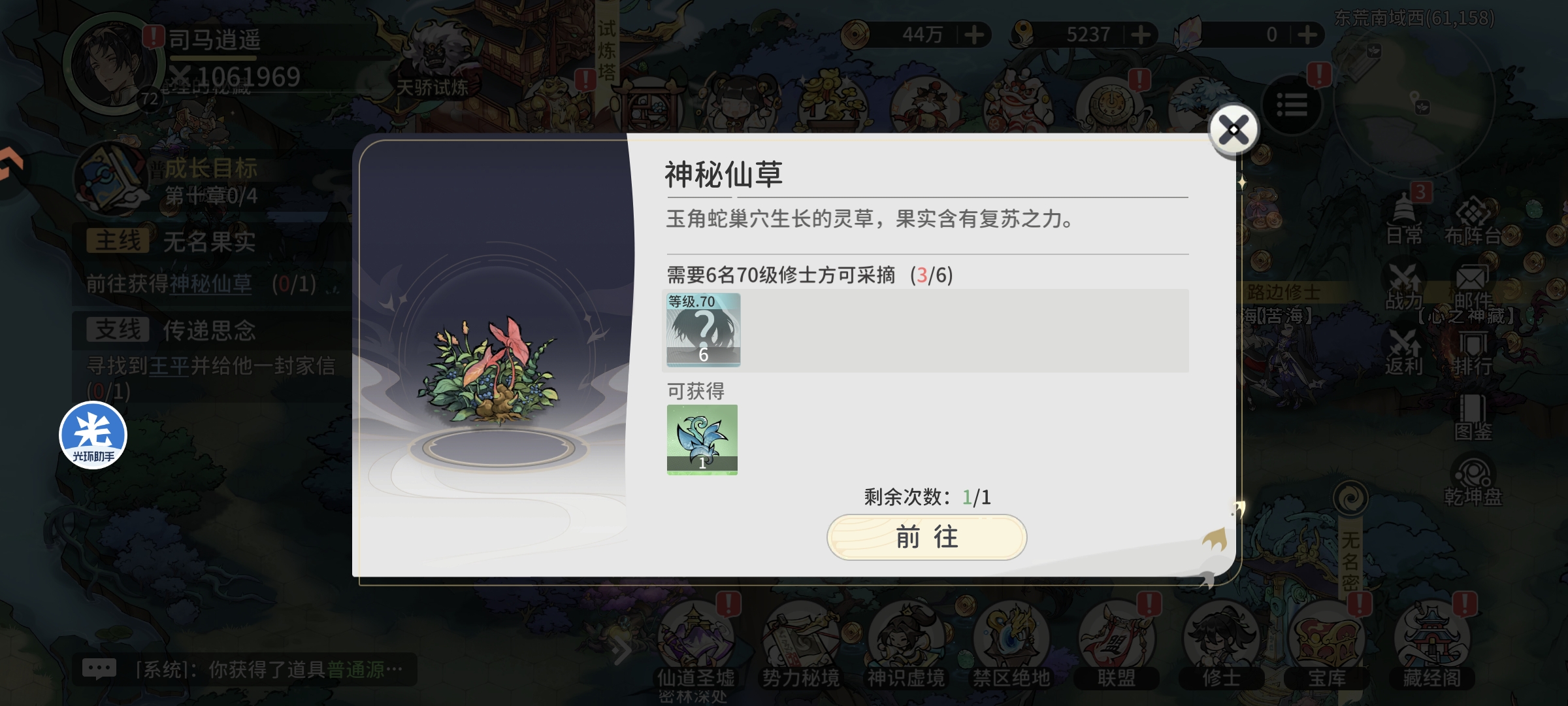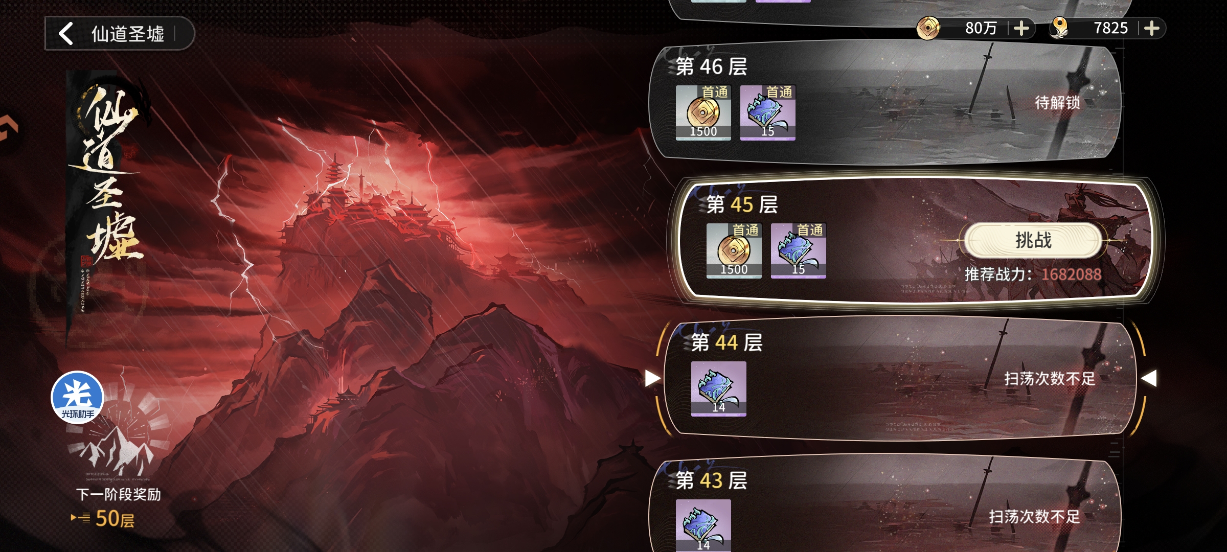 完成主线任务后进行仙道圣墟挑战,通关44层会卡45层获取橙色功法培养资源,将主将功法升级至30级,副将功法升级至20级,战力提升至115万+