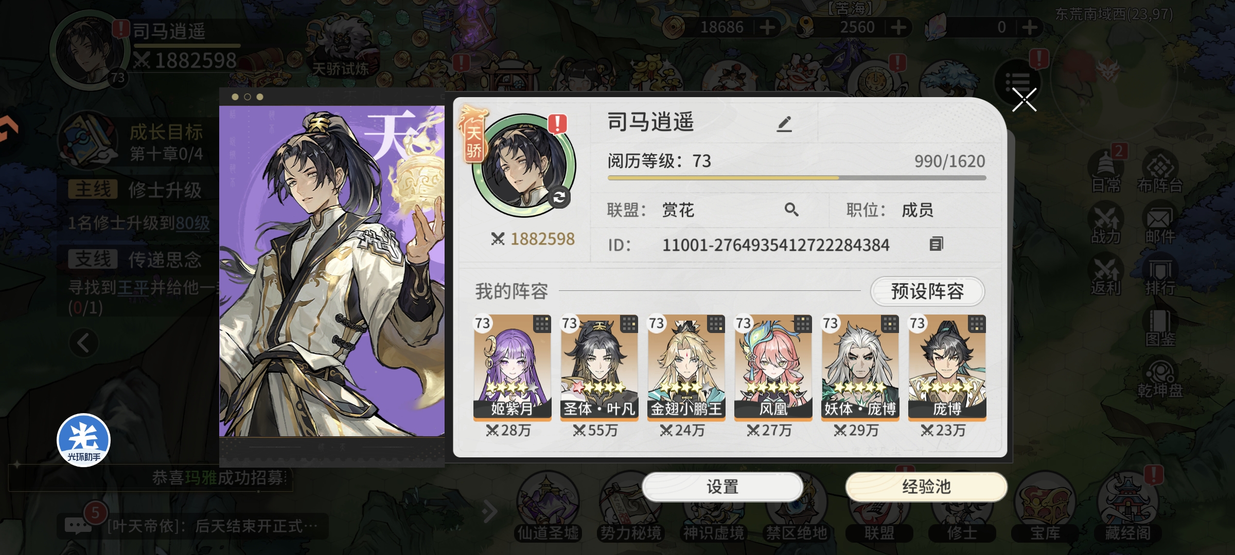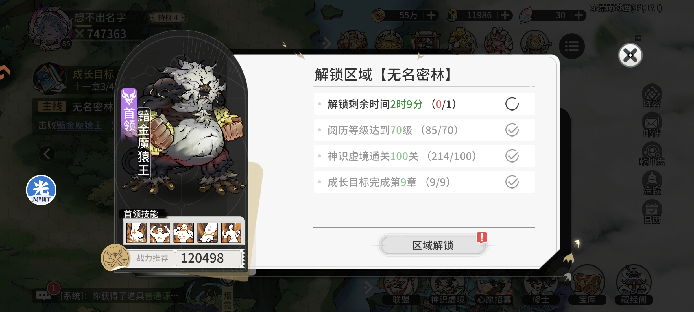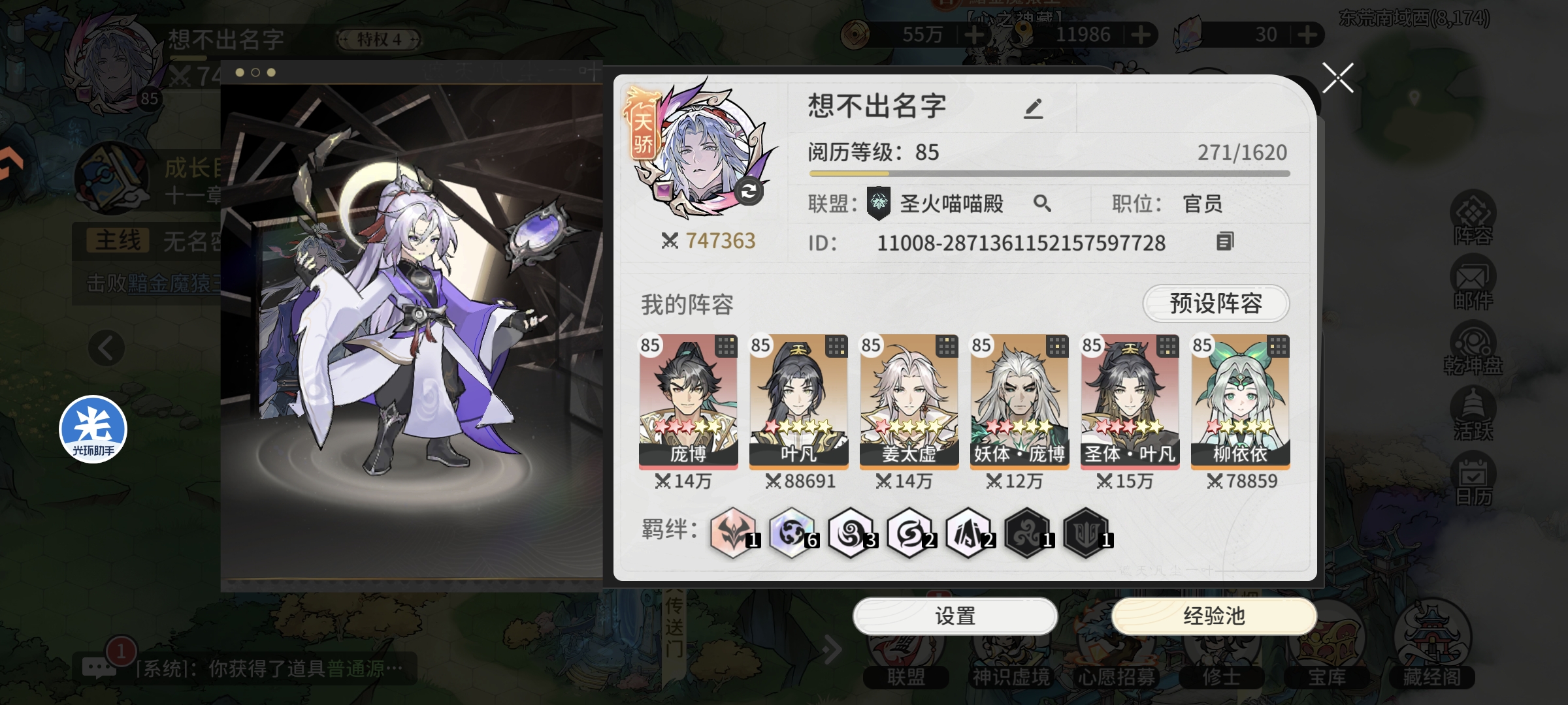 第四天主角等级85级,总战力74万+,钻石12000,神识虚境通关214层