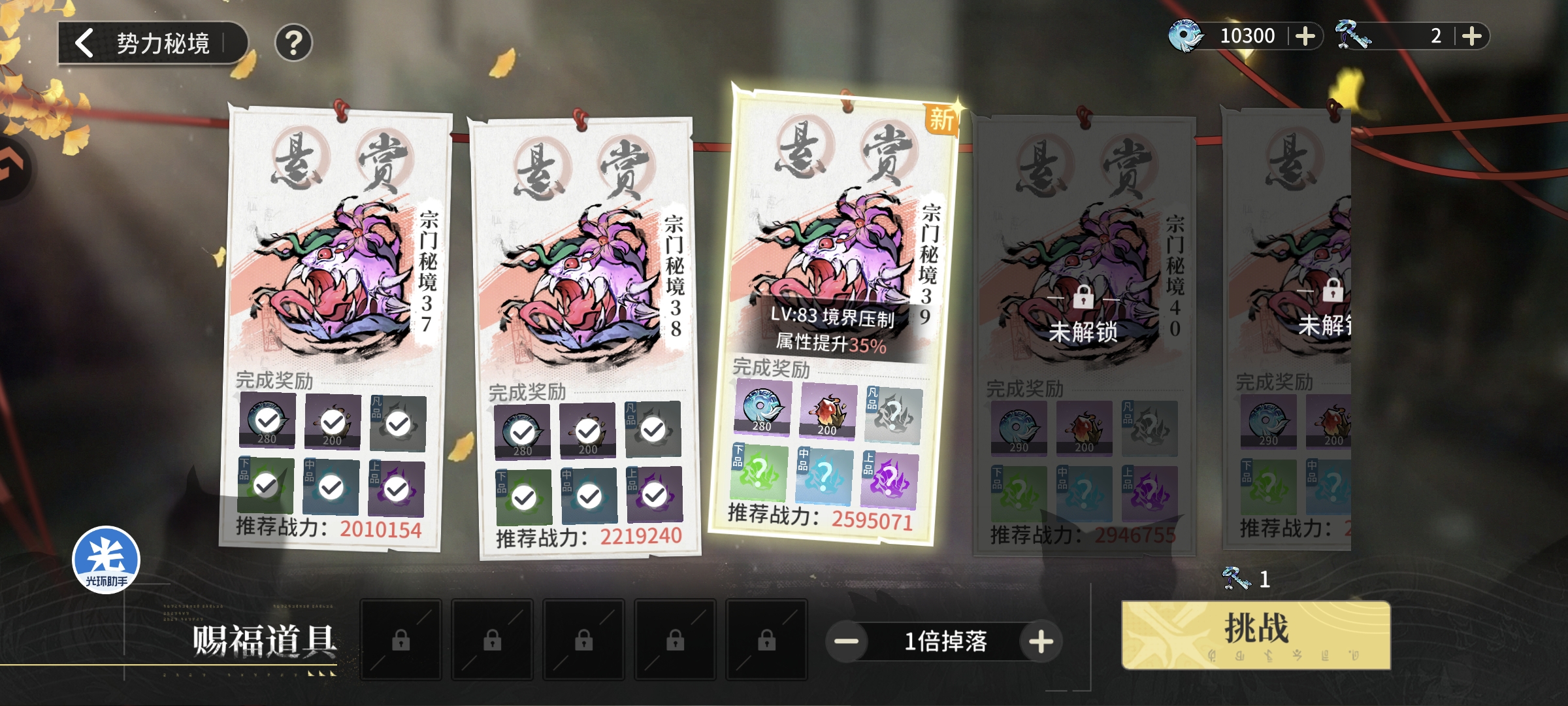 进行特权等级购买,提升等级至3级购买橙色叶子进行功法抽取,同时进行势力秘境挑战通关至39层,其他势力钥匙全部进行挑战获取资源(第四天会卡关40级不需要留钥匙)遗物可以得到1-2个紫色和大量蓝色,将全体修士遗物替换并将主将遗物全部替换蓝色/紫色全体提升至60级,战力提升至188万+