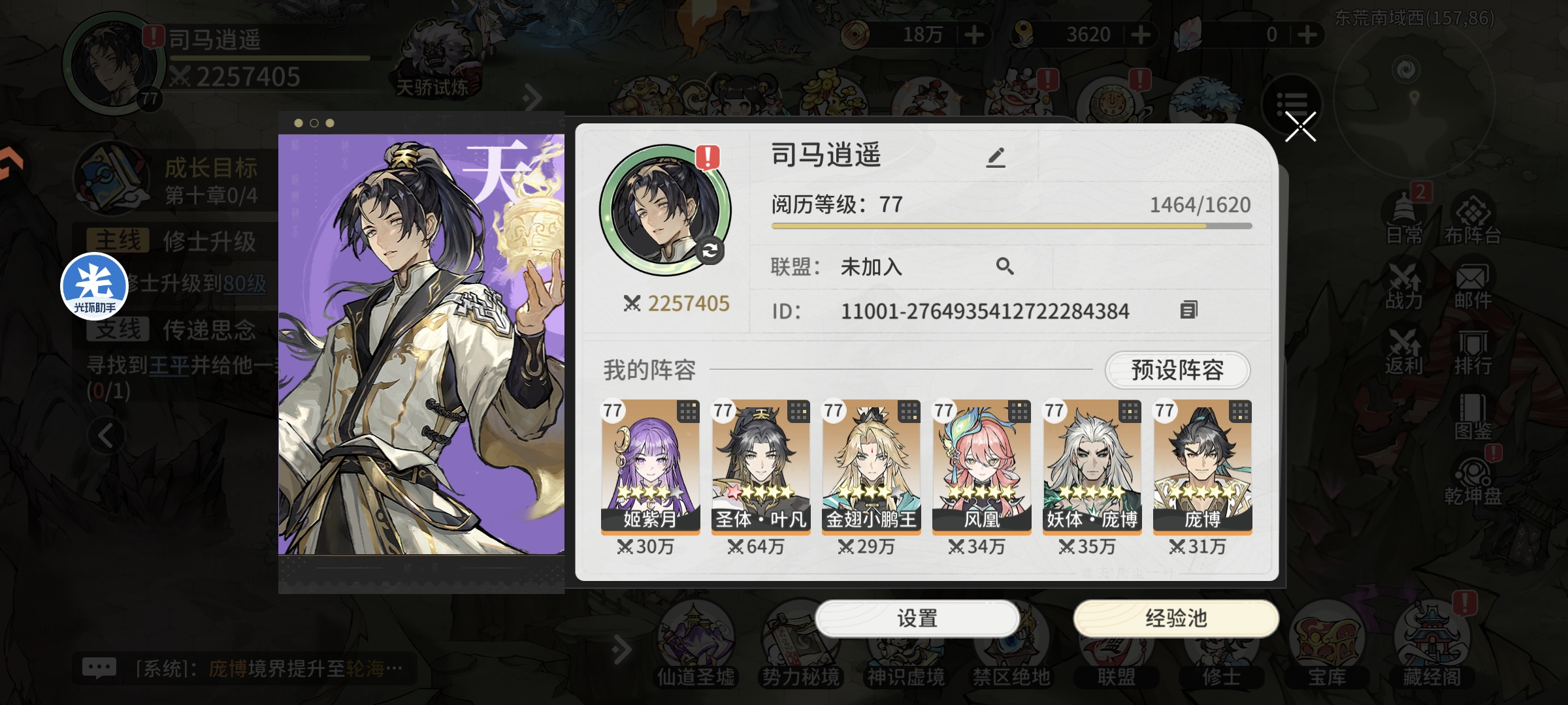 战力提升后进行仙道圣墟挑战和神识虚境挑战,神识虚境通关229层,仙道圣墟通关极限关卡64层,整合其他获取资源最终战力达到225万+