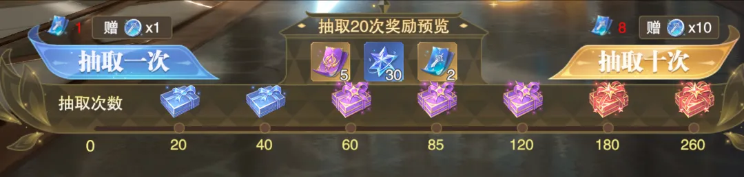 1280钻石神器礼包送20抽 每日880钻石购买10抽,3天便是2640钻石购买30抽 每日6元等礼包,最多可花费116元购买23抽,3天便是最多花费348元购买69抽 活动限购RMB礼包 每购买完6元、12元和30元每日礼包,分别可以解锁88钻石买10抽、88钻石买10抽和88钻石买20抽的权利,这部分每日就是可最多消耗3520钻石购买40抽,但前提每日必须花费48元保底 购买完2个328元礼包后可以解锁120钻石/抽的权利,限购999抽 累计260抽后最多可以返还18抽