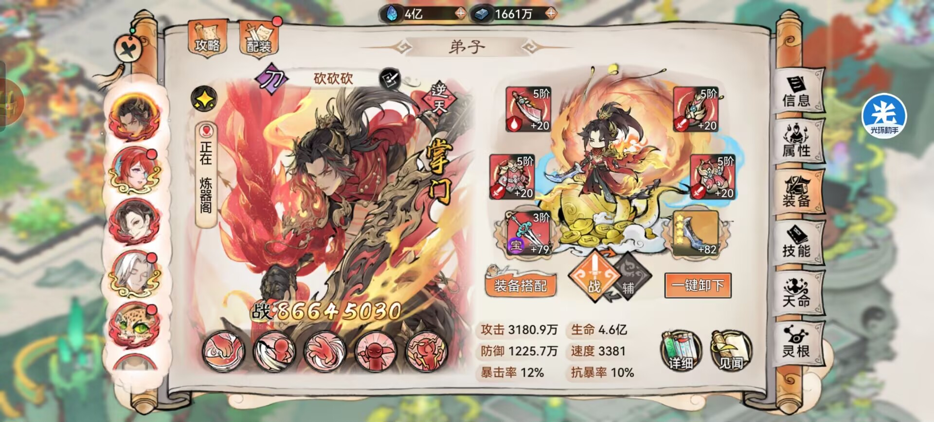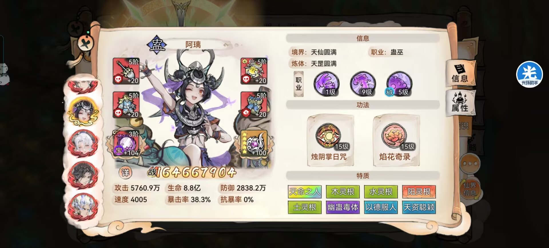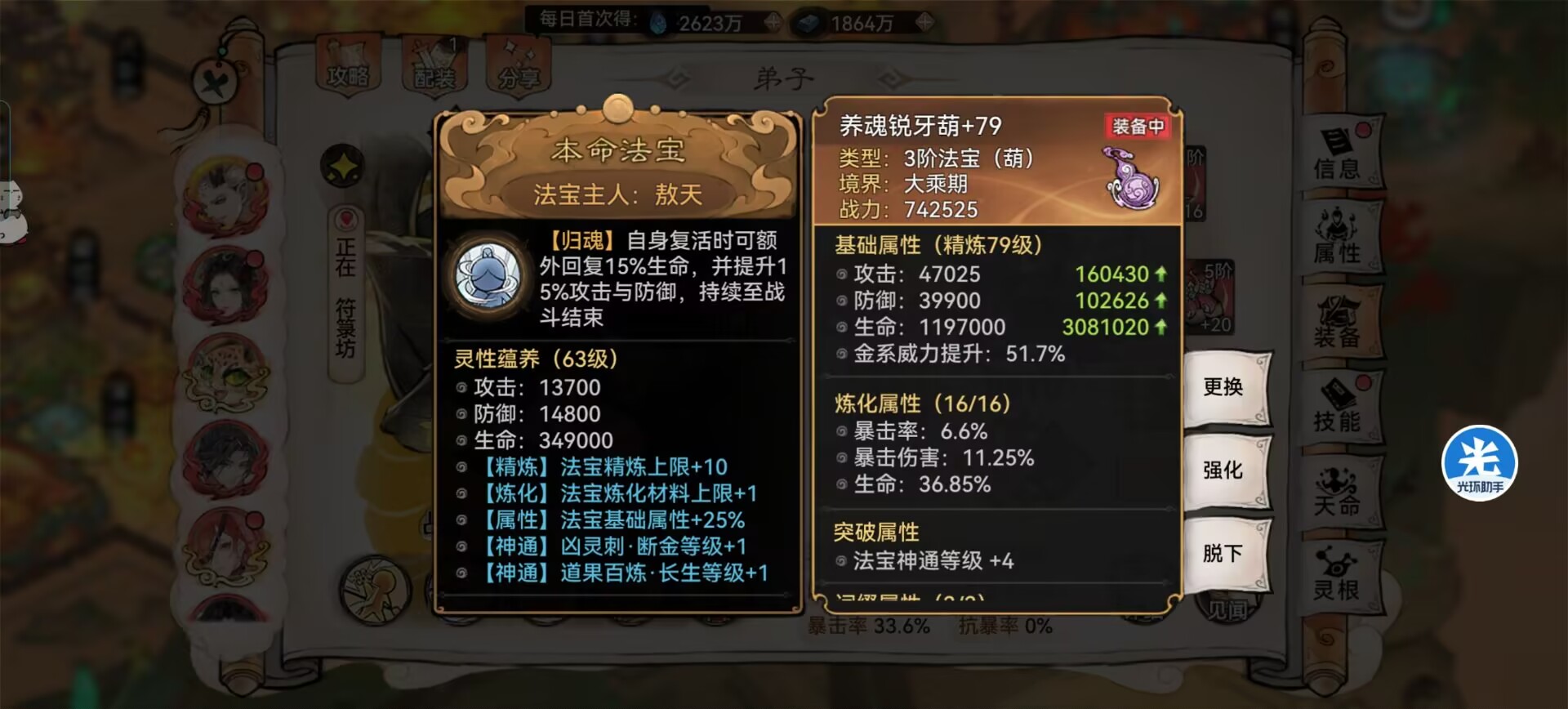 另外本命法宝【养魂葫芦】复活起来提供的攻击和防御配合军阵属性加成,面板属性直接膨胀。
