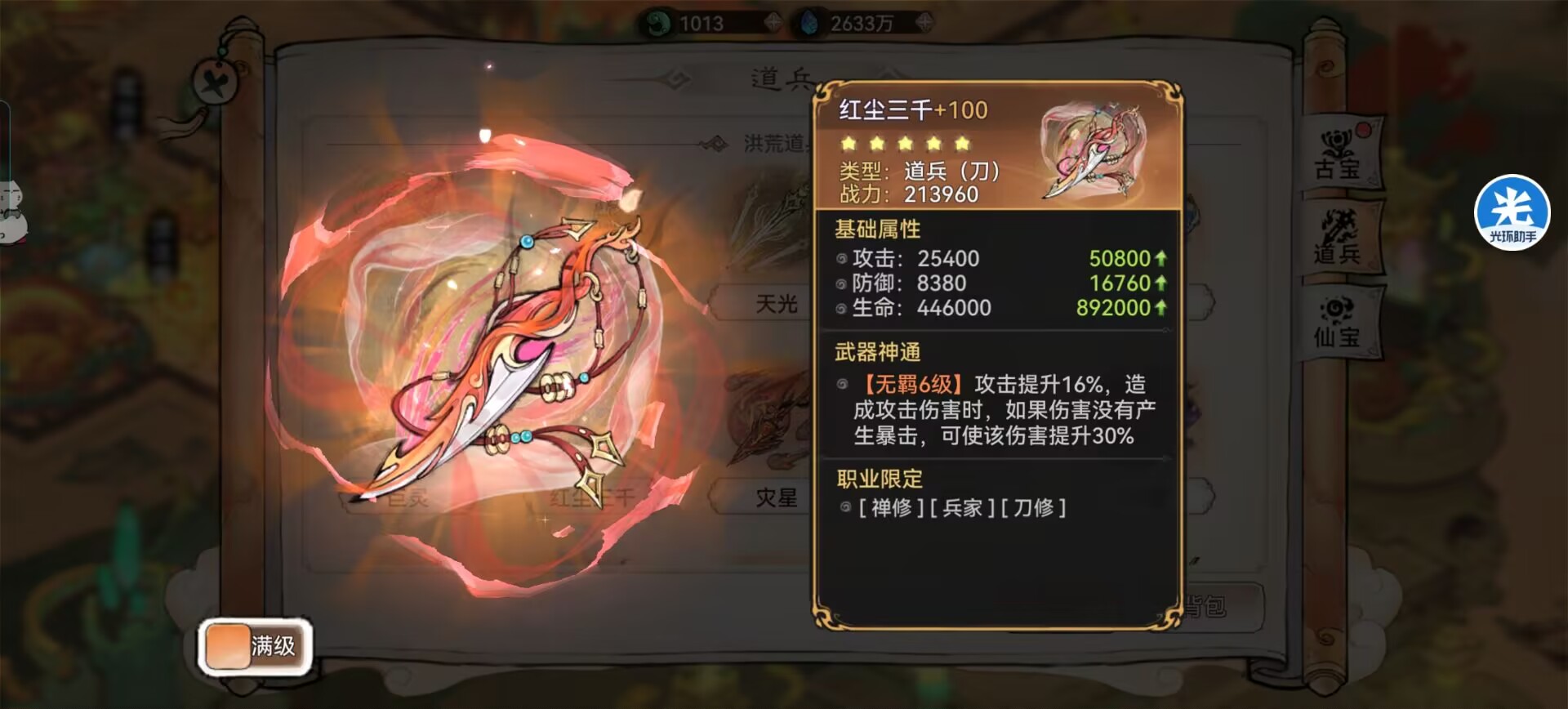 红尘三千打仙墟伤害丝毫不会输给本命道兵,别小瞧这个道兵哦。