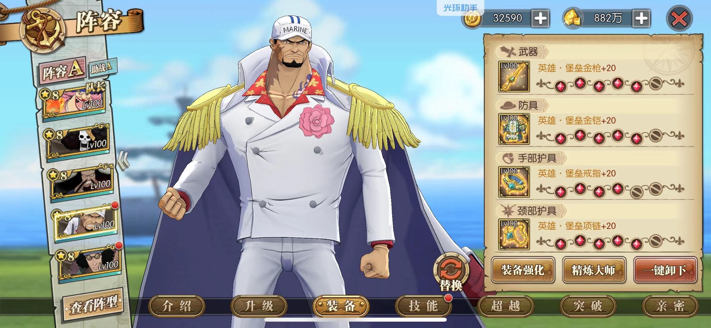 推荐理由:不想被恶心还是留着藤虎吧,赤犬当前排,库赞对位,藤虎躲凯多身后保1回合。这套阵容是目前碰到最多的,相对来说比较稳定,但缺乏乐趣。