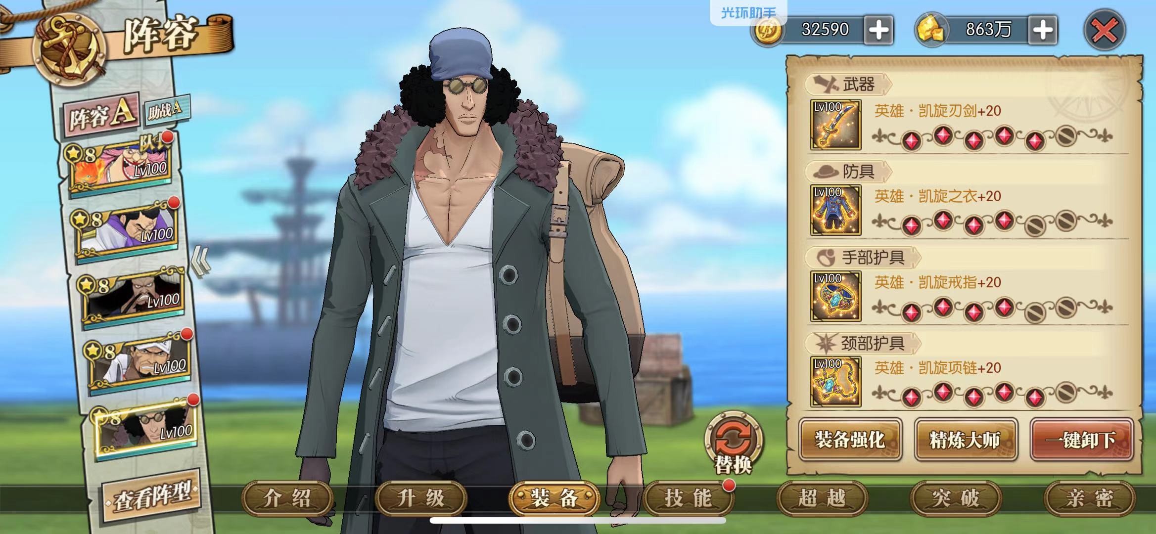 推荐理由:不想被恶心还是留着藤虎吧,赤犬当前排,库赞对位,藤虎躲凯多身后保1回合。这套阵容是目前碰到最多的,相对来说比较稳定,但缺乏乐趣。