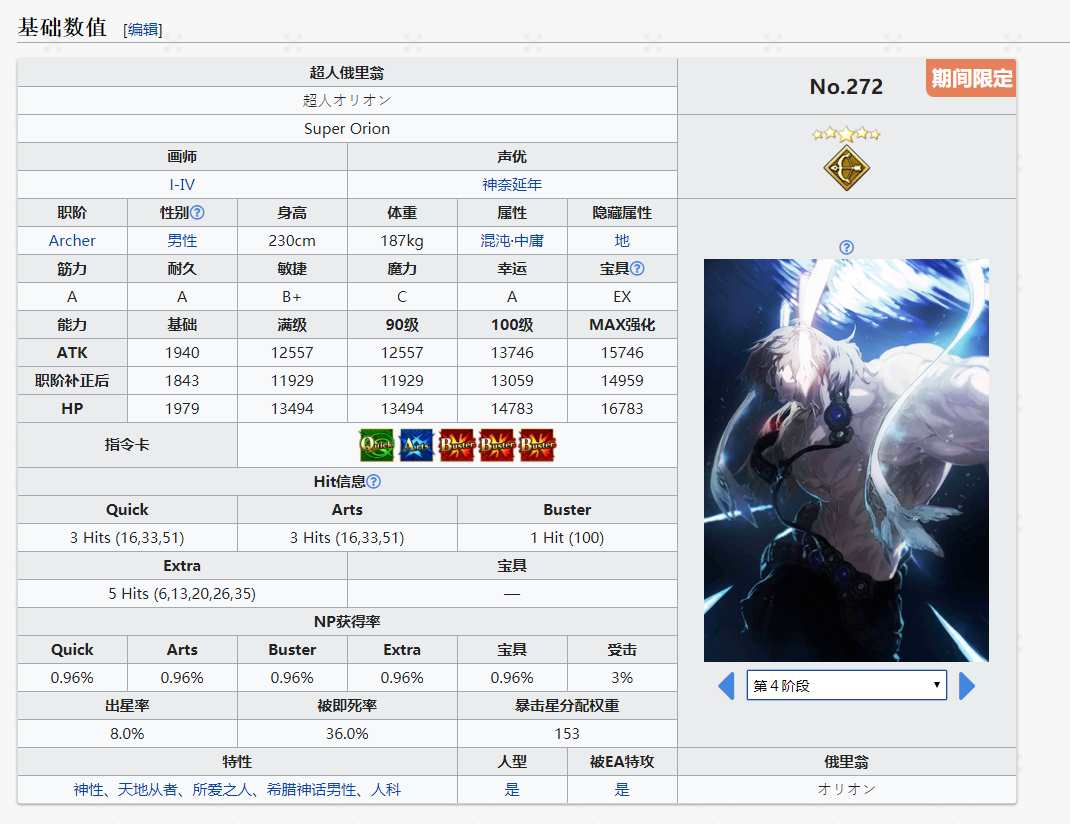 超人俄里翁满级HP13494,HP在弓阶从者排名之中排名第七,比较其他五星弓阶从者来说中规中矩。