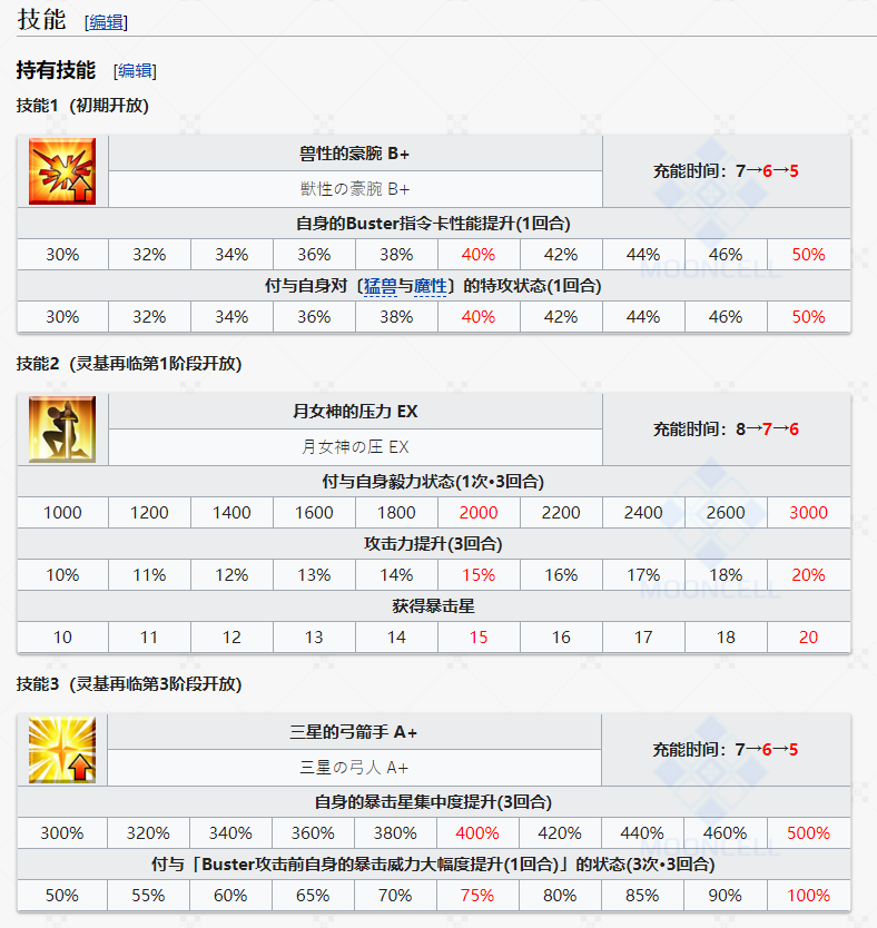 三技能「三星的弓箭手 A+」赋予自身暴击星集中600%三回合+红卡攻击前暴击威力提升大幅度提高,满级提高100%,三次三回合。