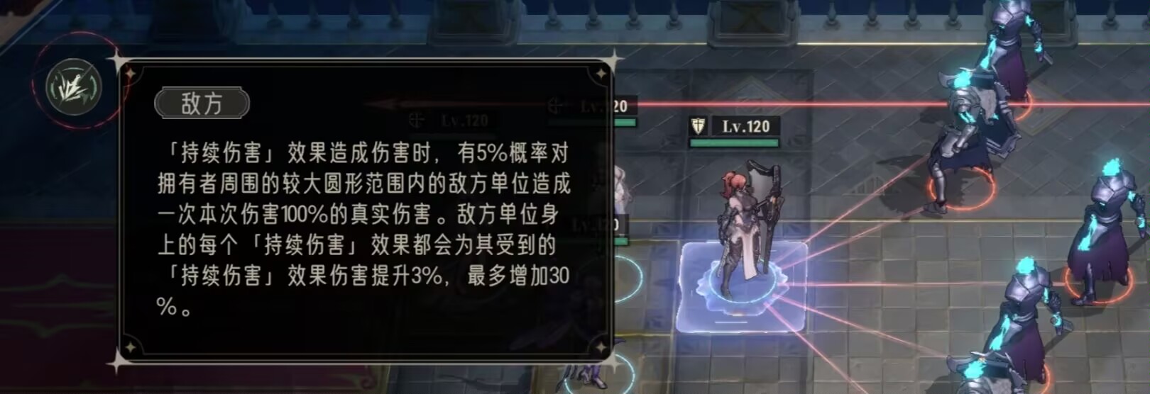 ④关卡buff:持续伤害造成伤害时,有5%概率会额外对周围敌人造成1次100%真伤,敌方身上的持续伤害越多,我方造成的持续伤害越高,最大可以提升30%的持续伤害。