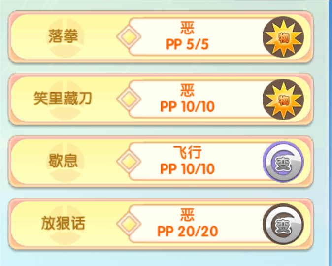 这套技能组合是比较全面的,落拳加回血应该是所有辅助精灵的标配,至于笑里藏刀的话,主要是针对对方的辅助,还有一些能够回血的输出,说白了就是兼顾所有回血宠物,至于最后的放狠话的话,就是自身上场之后如果对方头铁,那就像我前面说的那样,直接一个放狠话,切队友进行压制,或者是抓人处理,至于道具的话,可以考虑回血或者是减伤道具都可以,这个精灵能够学习的技能很多,还有就是紧咬不放,缺点就是命中率低,玩法的话就是自身首发登场之后直接在皮囊状态下使用。该技能将对方抓住,然后慢慢的使用咒语或者是毒将对方抓死,缺点的话就是小火龙失去皮囊状态之后,你能不能吃得消?后续的对方伤害,这才是重点,最后总结一下,就是这个技能机制很特殊,但是强度很一般,真爱党可以尝试或者是能够开发出它的一些特殊玩法的玩家倒可以尝试尝试,否则的话就算了。