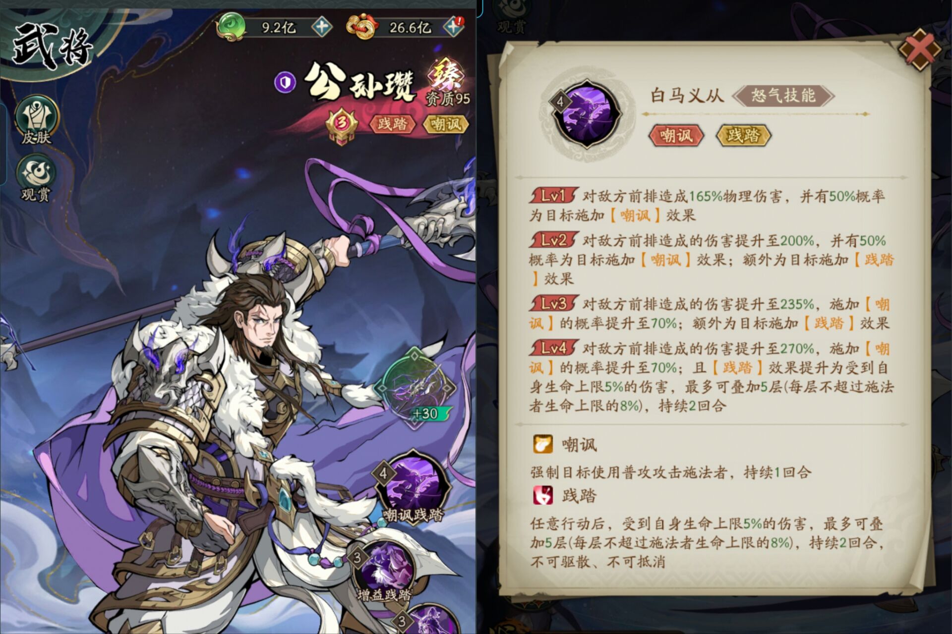 总结:公孙瓒的被动就是保护技能,能够优先保护残血队友,同时也可以配合怒气快速给敌人叠加【践踏】效果。
