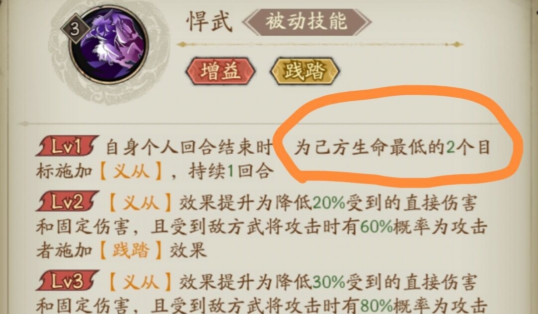 自身回合结束时:就可以给我方生命最低的2个目标施加【义从】。