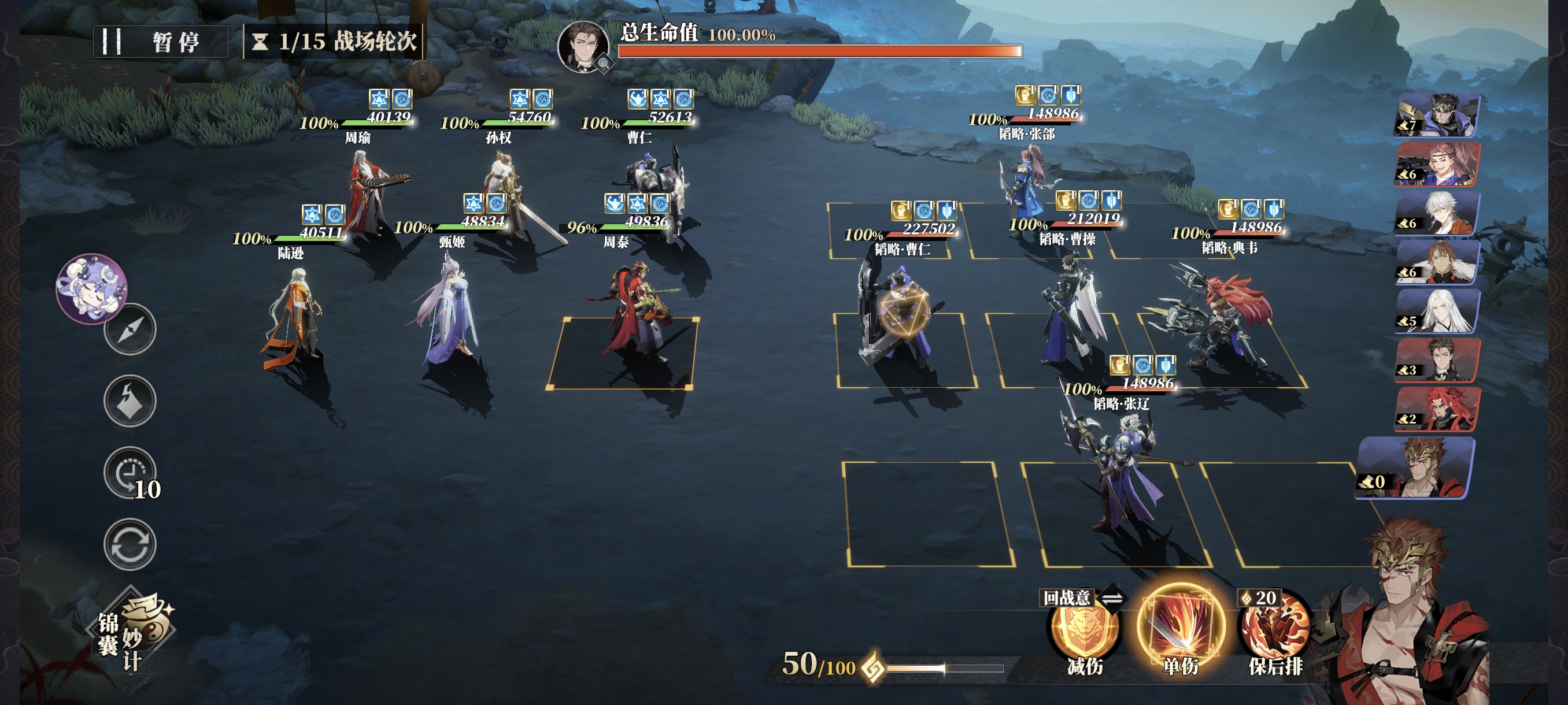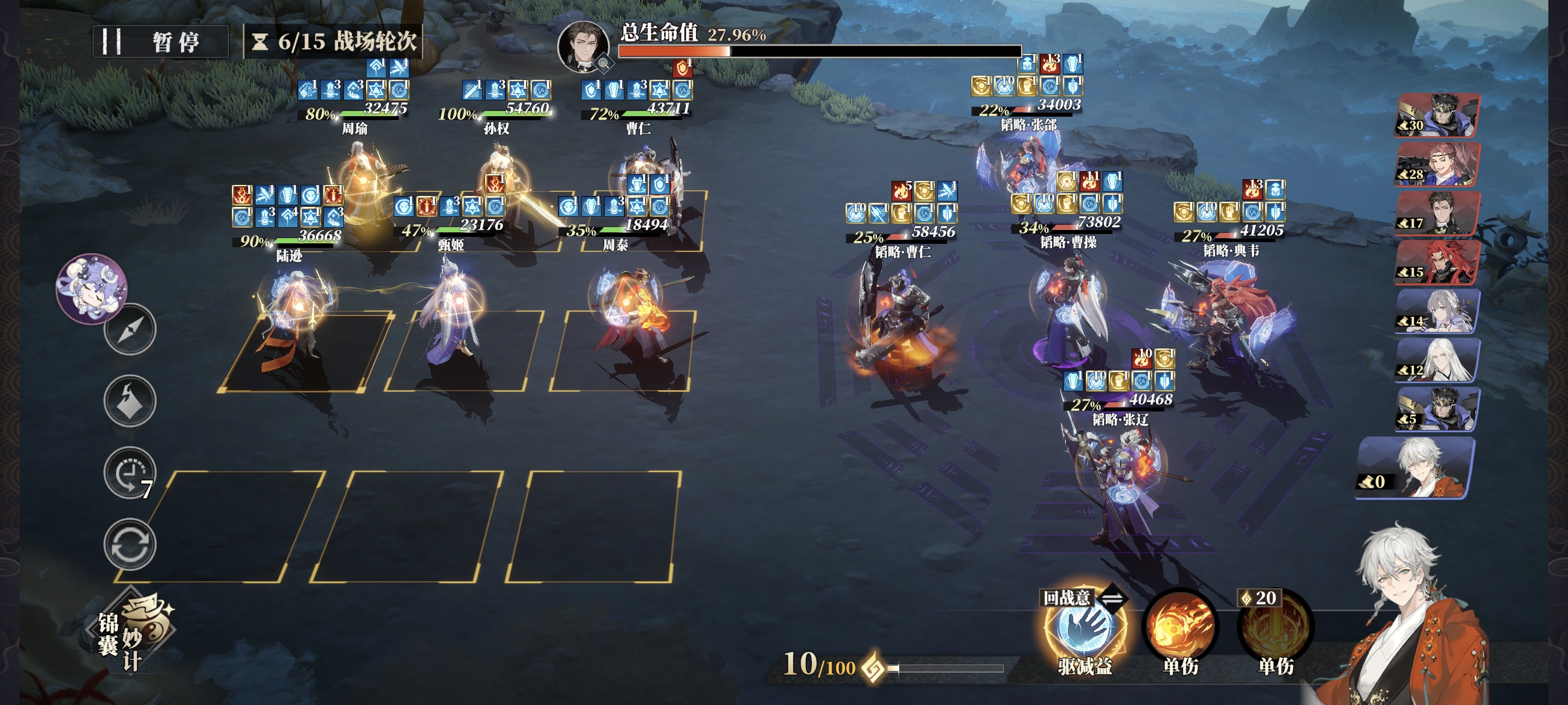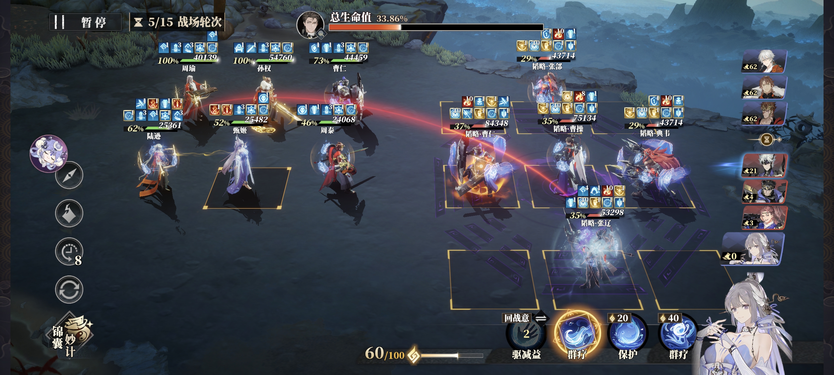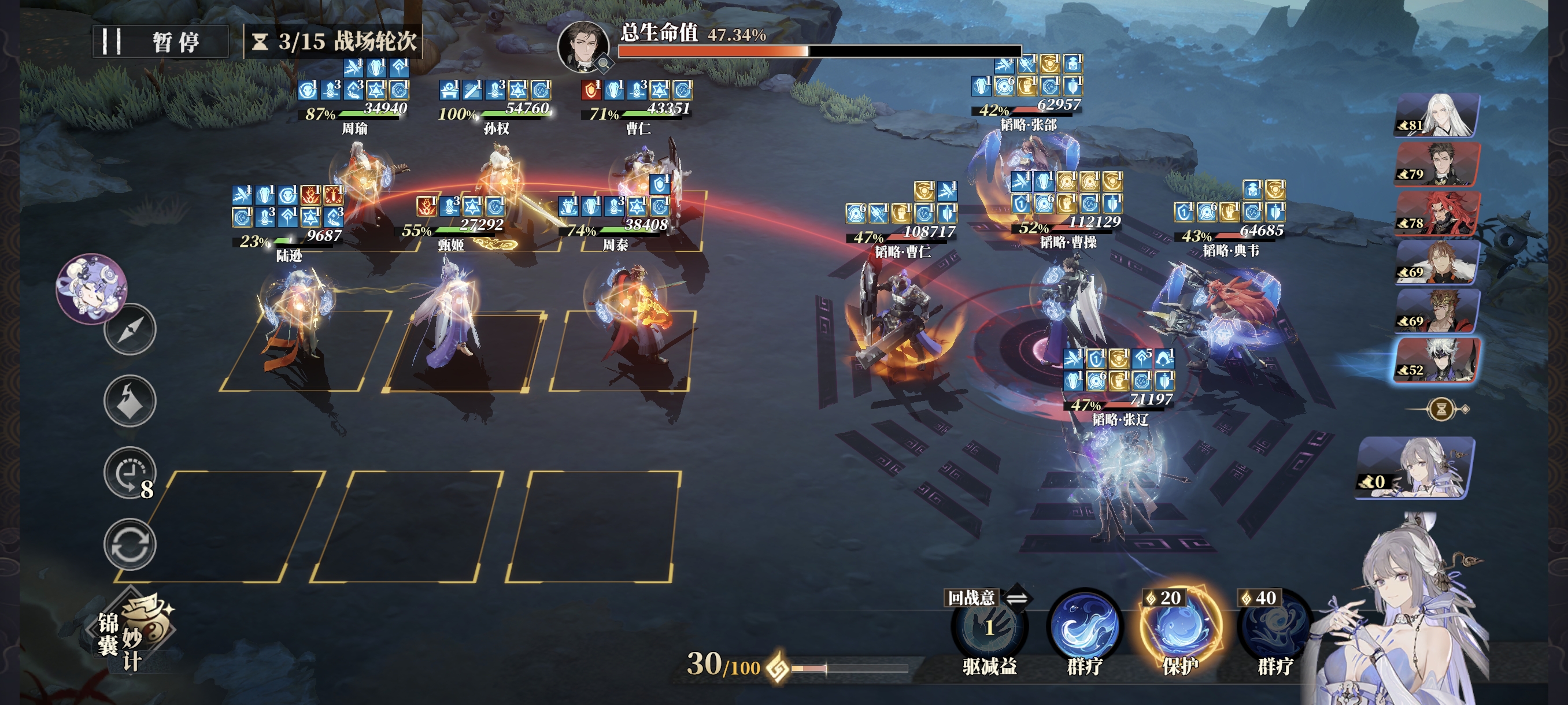 战意紧张时,也务必保证肉盾和辅助的战意使用,C位可偶尔使用通用技能,但曹仁的格挡、甄姬的治疗、孙权的拉条+必挡不能断。曹操开场军阵三连发,因为曹操会不停的全体驱散,所以周瑜全程只放大招挂火不引爆。
