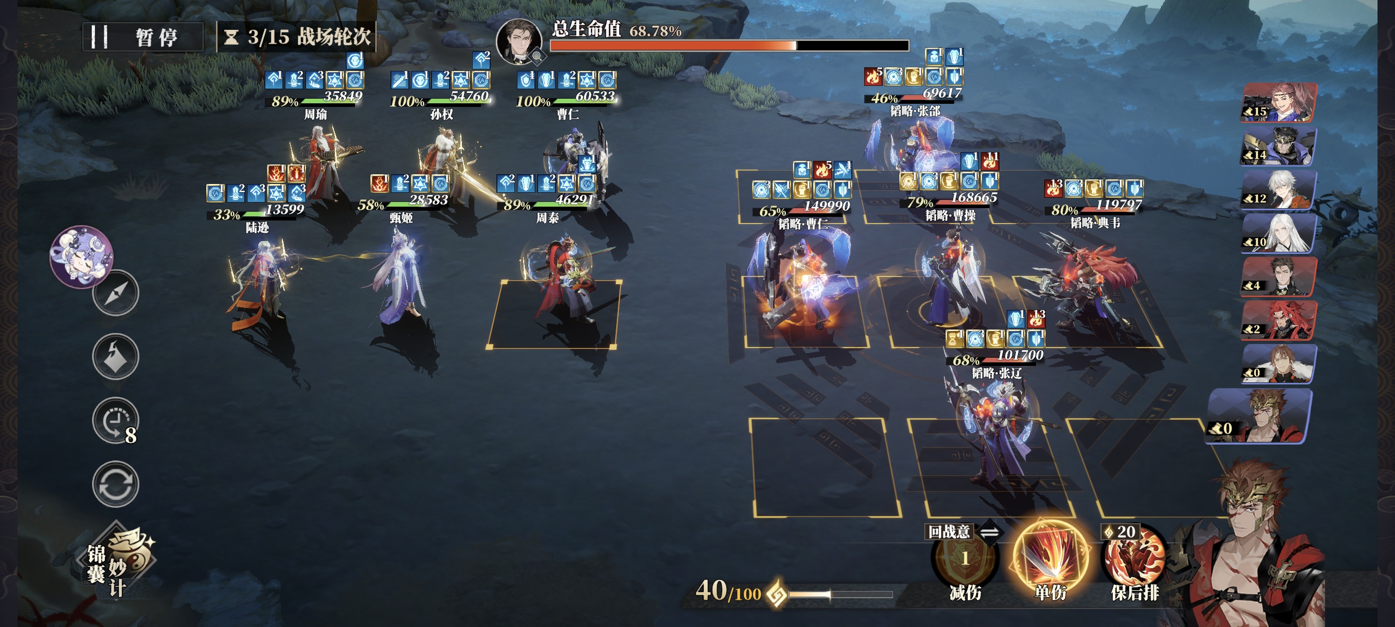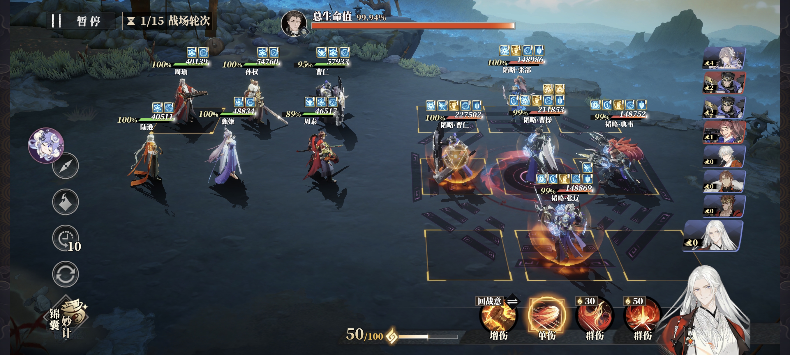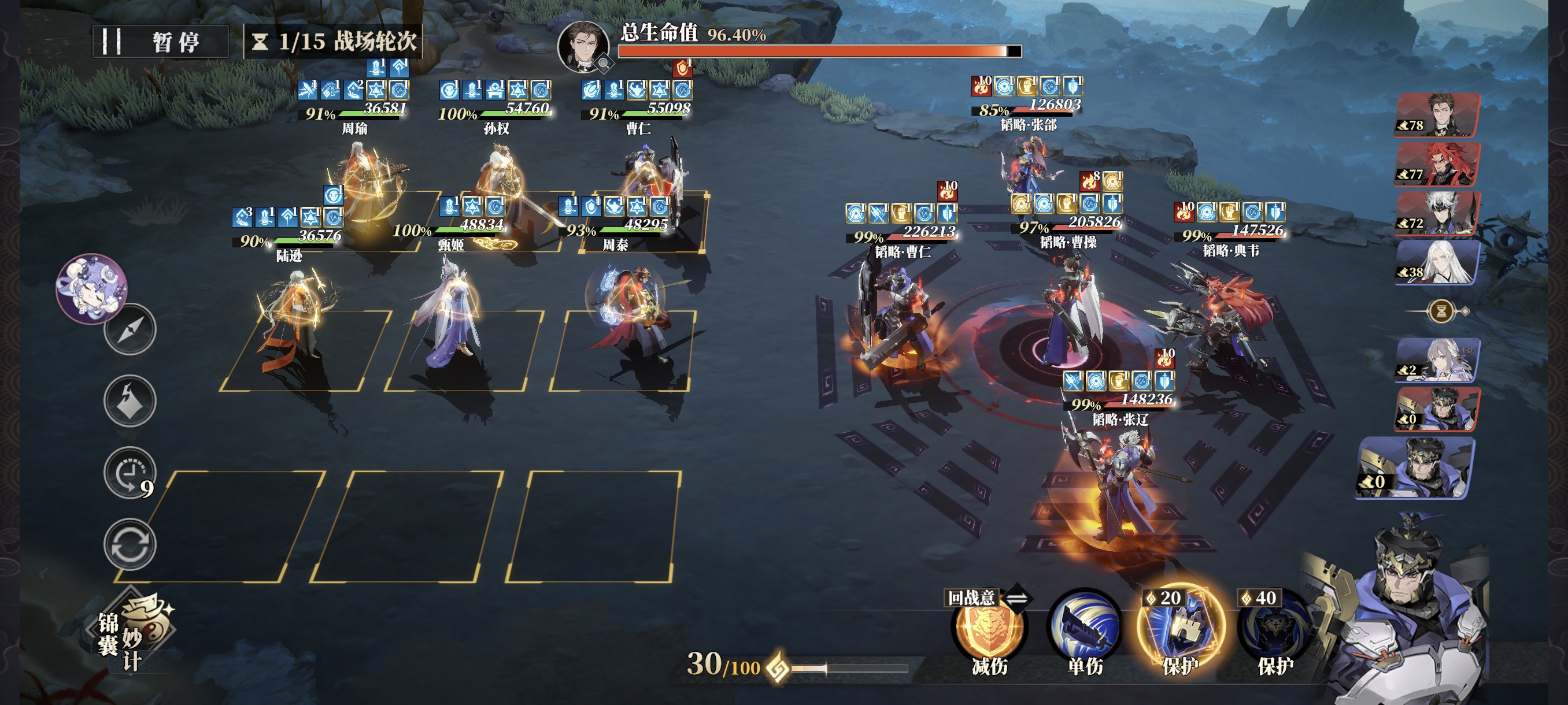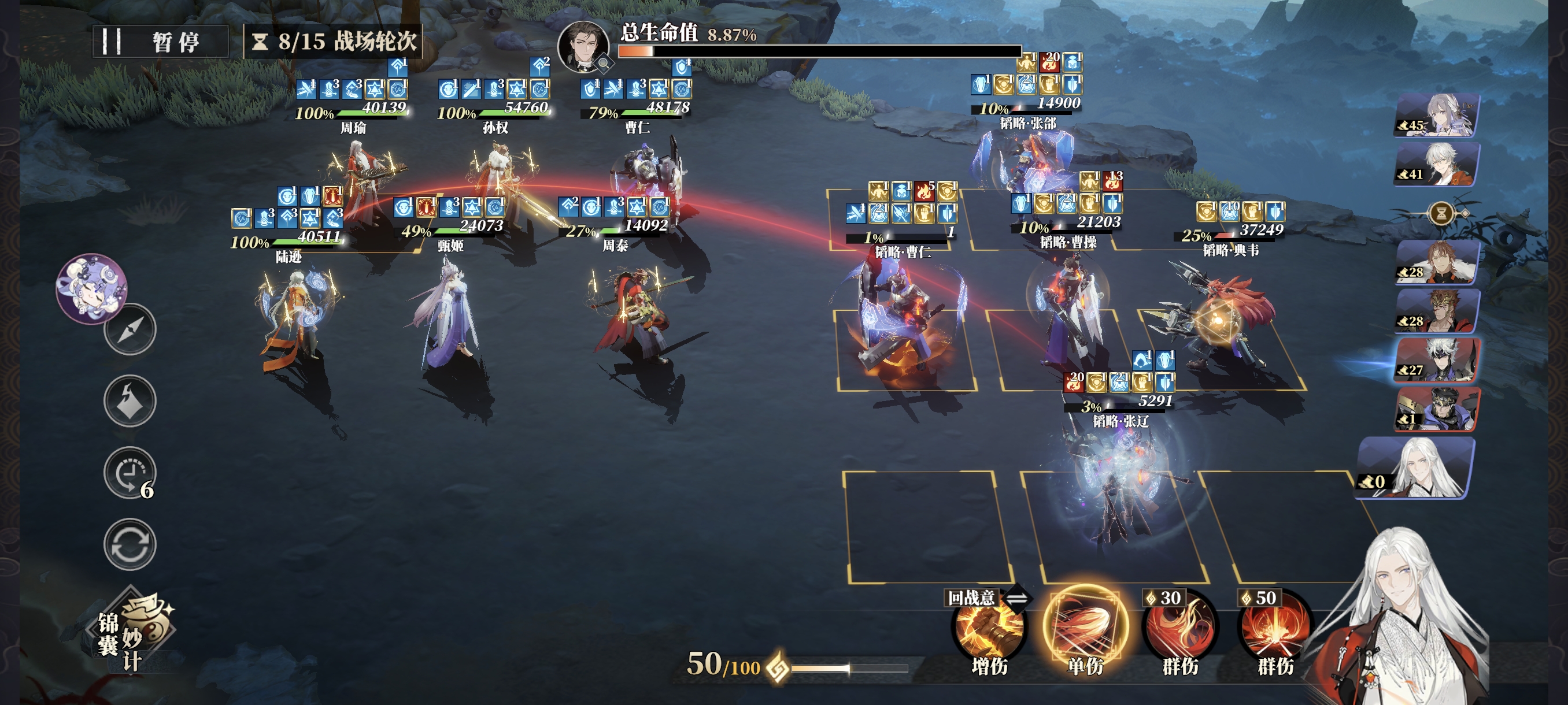 战意紧张时,也务必保证肉盾和辅助的战意使用,C位可偶尔使用通用技能,但曹仁的格挡、甄姬的治疗、孙权的拉条+必挡不能断。曹操开场军阵三连发,因为曹操会不停的全体驱散,所以周瑜全程只放大招挂火不引爆。
