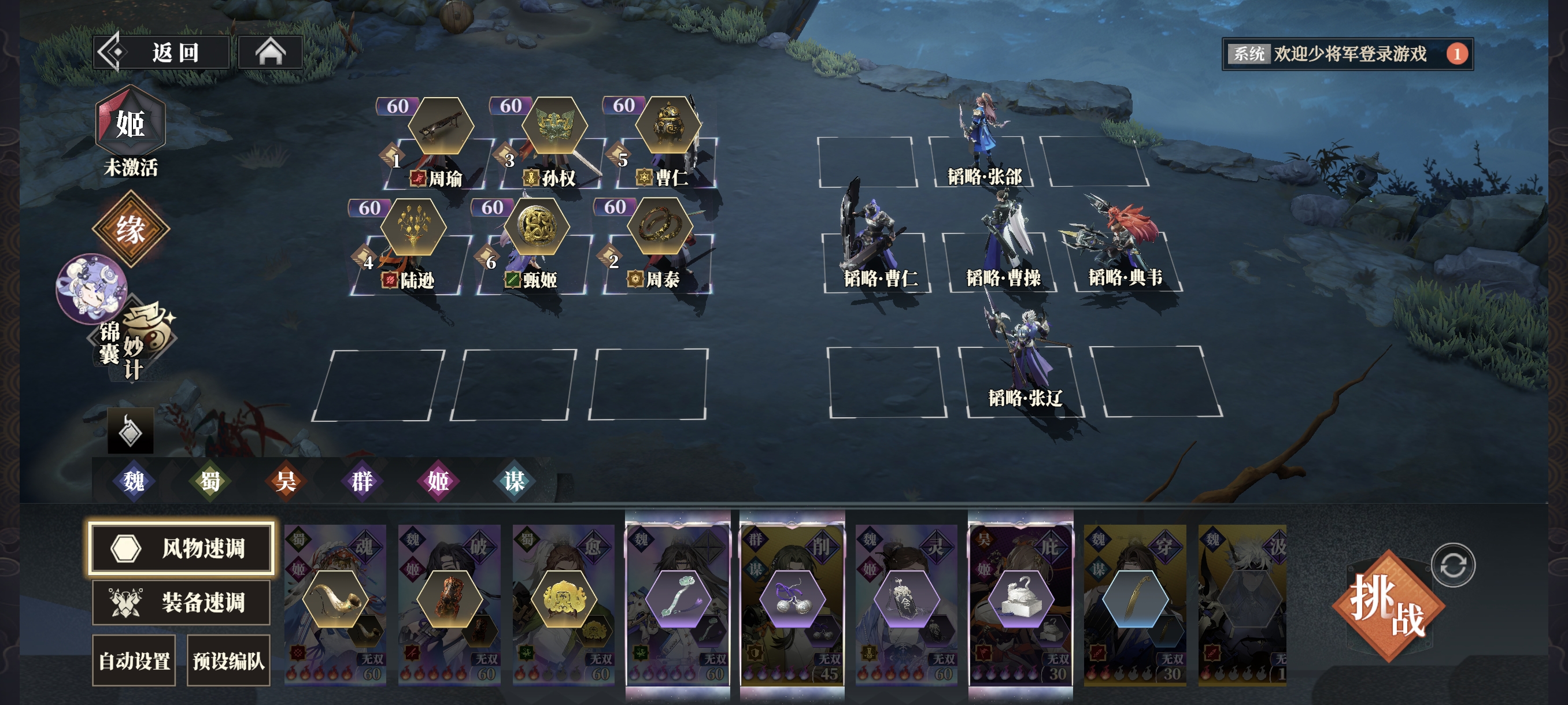 风物方面,刚需满星醉月无顾,其他无间、岳峙、空谷、片石有就行,星级无所谓。曹仁带任意防御型风物即可,没有橙色也可以用紫色的三振律。