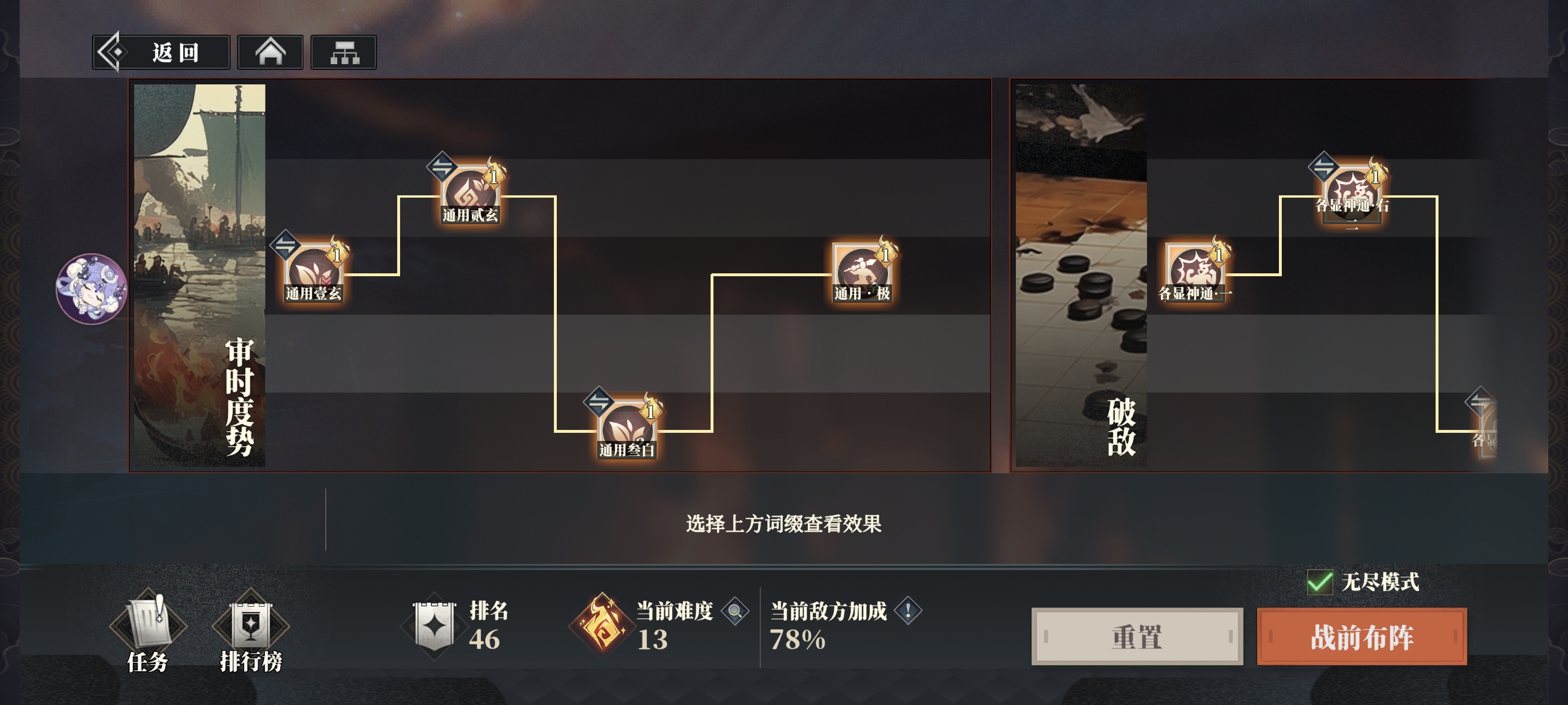 本期韬略破阵词条数首次达到了13个,全部选择后难敌方获得78%攻击和血量增幅,以及大量词条特性。
