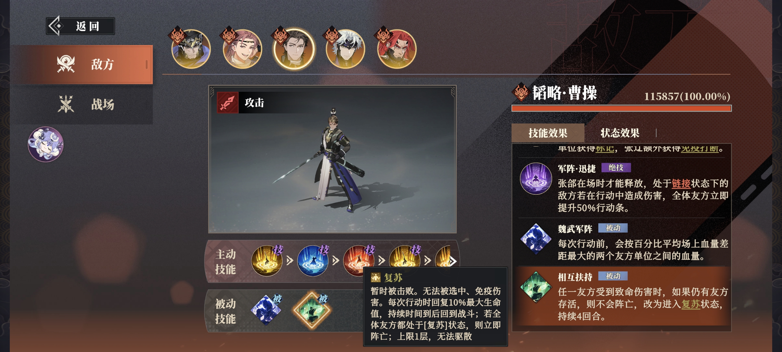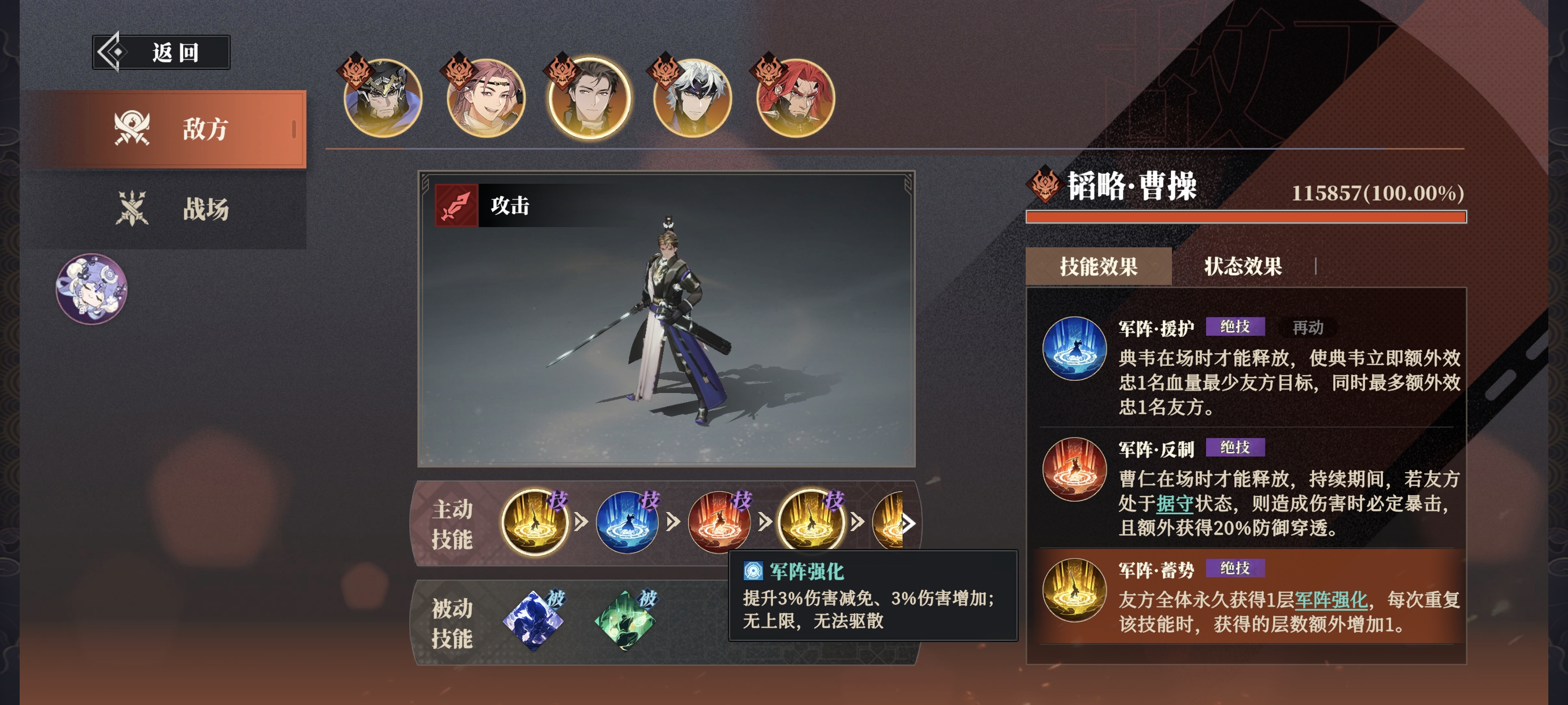 敌方的核心武将就是曹操,他的所有技能均为军阵。其中四个军阵分别对应强化场上其他4名魏国武将。1、曹操的五大军阵