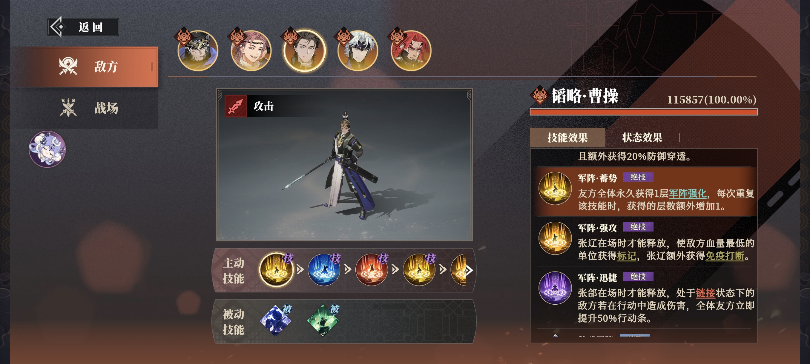 本期的机制是所有破阵中最复杂的,因为敌方没有杂兵,5人全为武将,并且都是超级强化后的模式,所以只分析最重要能影响战局的机制。