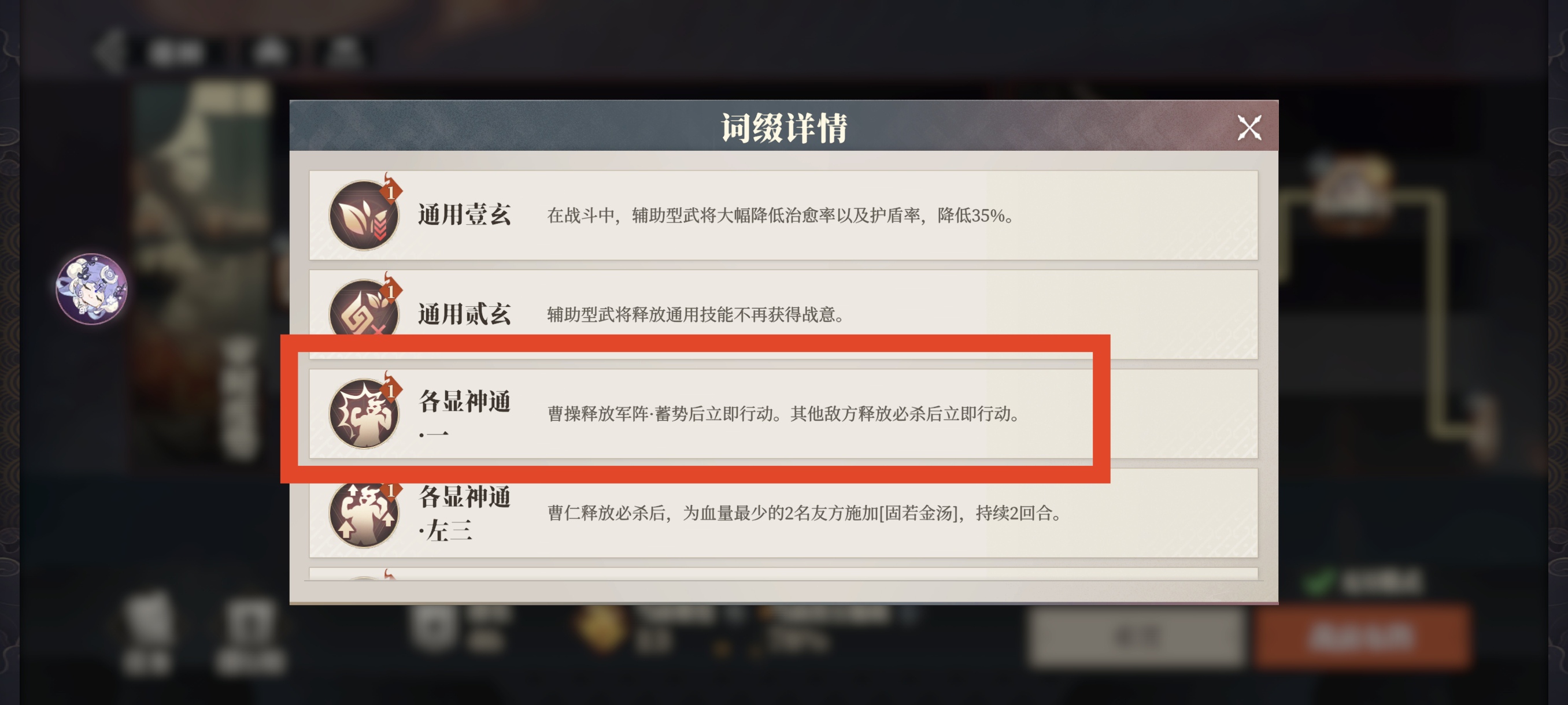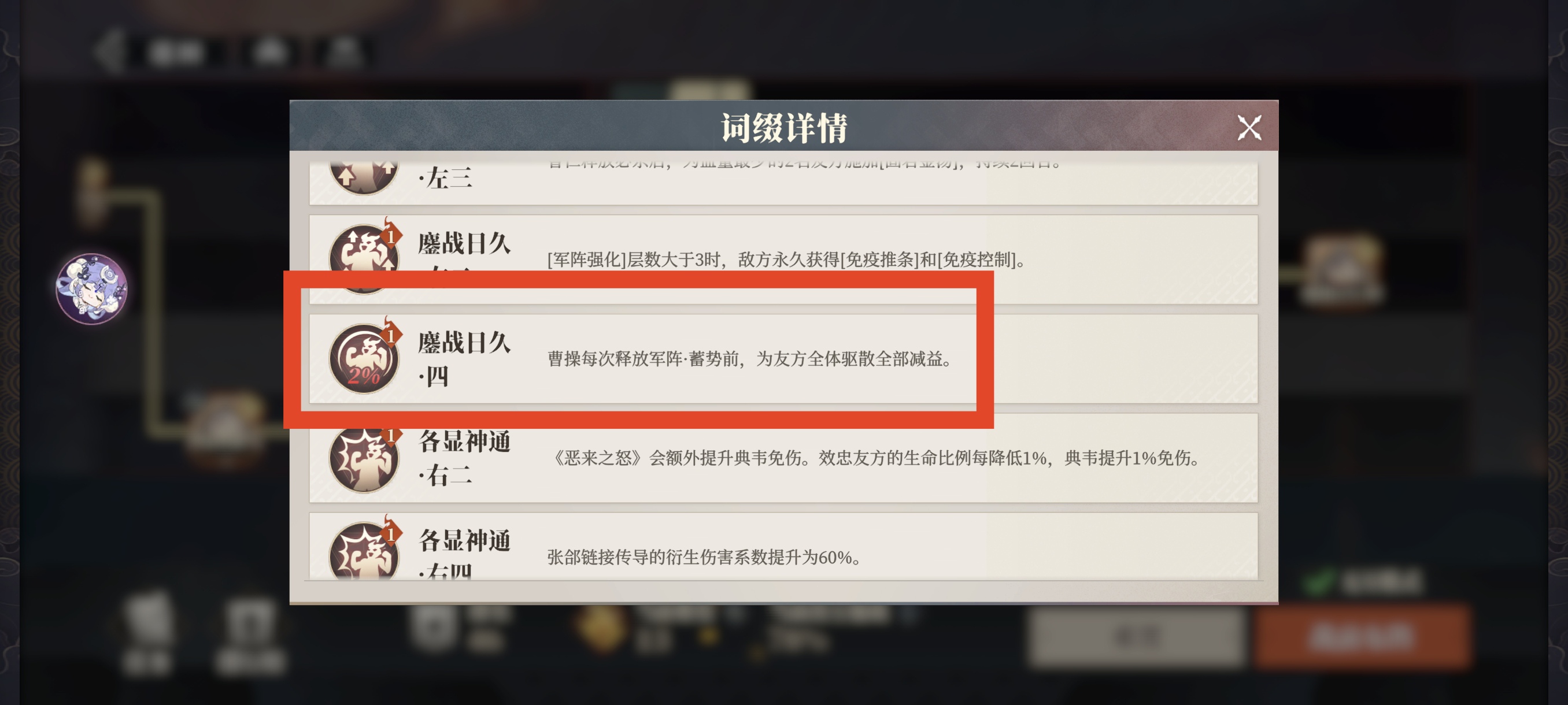 此词条为必选项,让曹操获得军阵三连放的特性,曹操速度极快,开场行动直接三个军阵连放,对敌方进行大量强化。