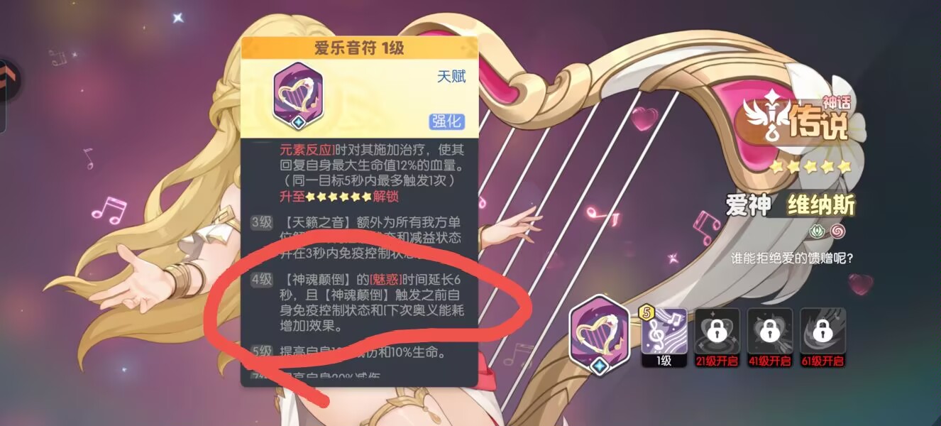 ⭐另外维纳斯天赋升到4级也就是红1星,不仅控制能力增加,而且在特级:神魂颠倒生效前。自身可以免疫所有控制和费用增加的效果。