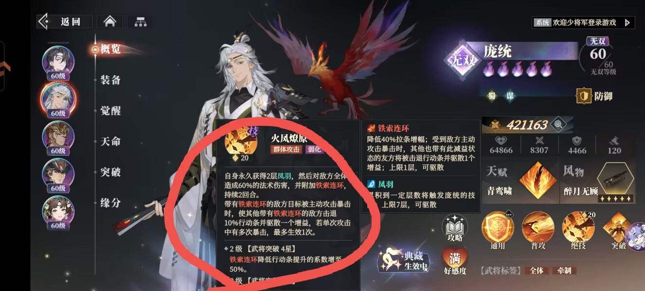 ⭐比如:我们的【庞统】就能够完美契合这个分摊伤害的机制。庞统的绝技:【火凤燎原】。